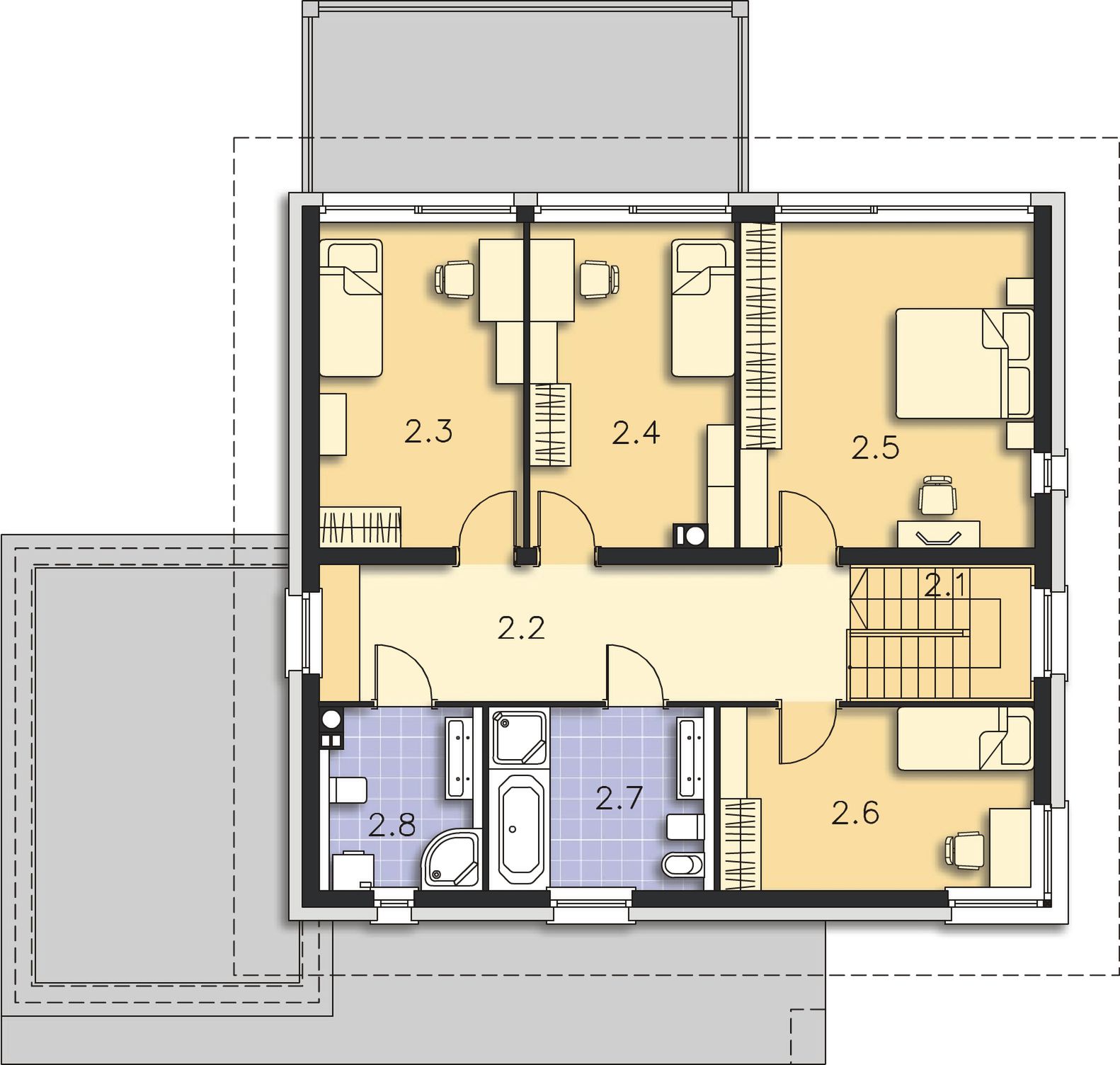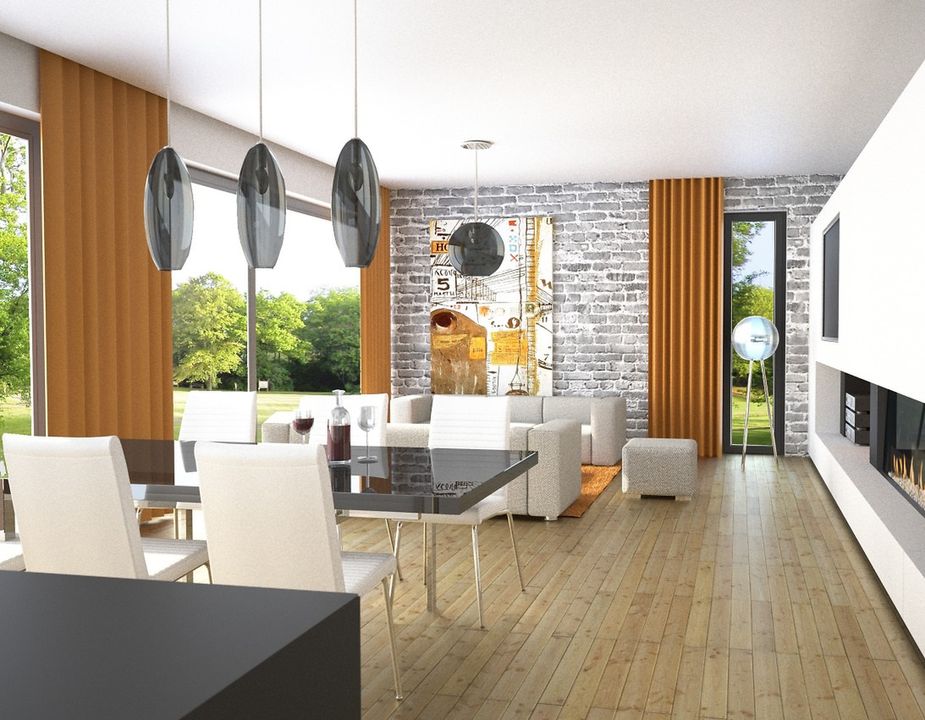 Graficzne opracowanie rzutów poglądowych widocznych na karcie projektu zostało wykonane przez Extradom.pl. Prezentowane przez Extradom.pl wizualizacje wykonane zostały przez autora projektu i należy poczytywać je jedynie za przykład i propozycję wykończenia, wizję architektoniczną autora projektu. Ostateczne wykończenie budynku może nastąpić na wiele sposobów. Szczegółowe rozwiązania zastosowane w oferowanej dokumentacji - w tym również ilość, lokalizacje i wygląd okien, drzwi, kominów - mogą w niewielkim stopniu różnić się od prezentowanej wizualizacji budynku.