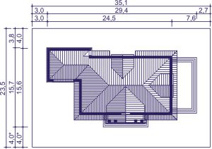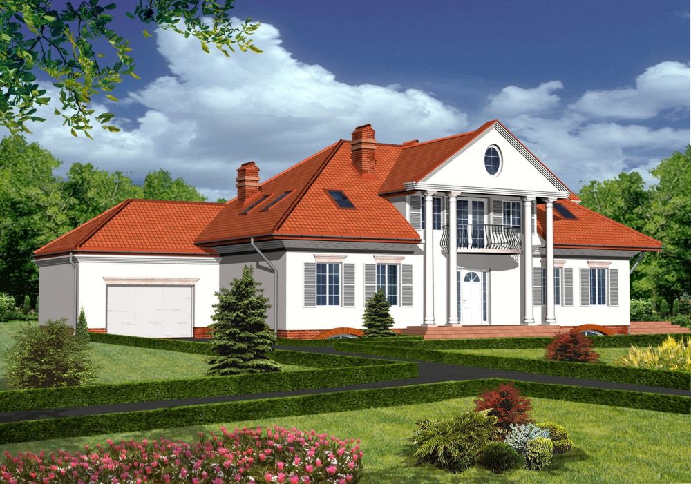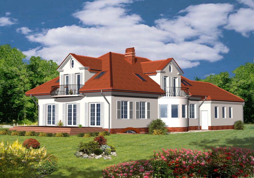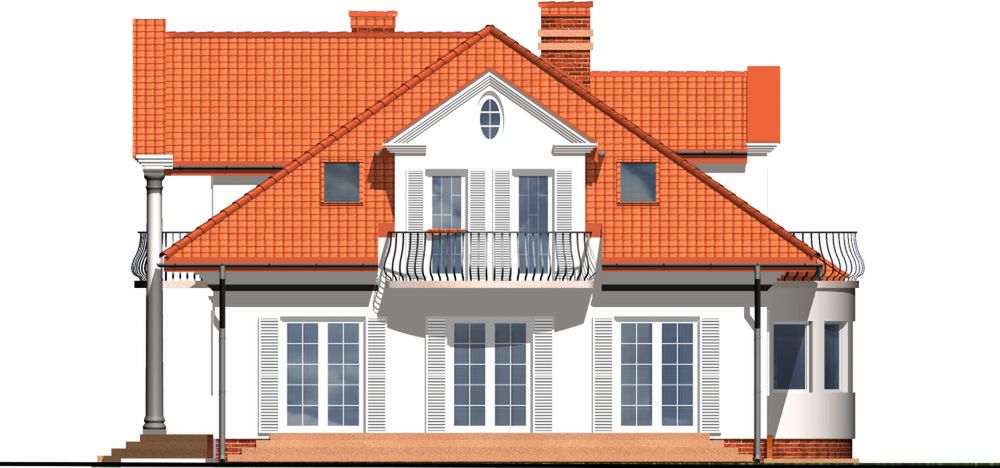 Graficzne opracowanie rzutów poglądowych widocznych na karcie projektu zostało wykonane przez Extradom.pl. Prezentowane przez Extradom.pl wizualizacje wykonane zostały przez autora projektu i należy poczytywać je jedynie za przykład i propozycję wykończenia, wizję architektoniczną autora projektu. Ostateczne wykończenie budynku może nastąpić na wiele sposobów. Szczegółowe rozwiązania zastosowane w oferowanej dokumentacji - w tym również ilość, lokalizacje i wygląd okien, drzwi, kominów - mogą w niewielkim stopniu różnić się od prezentowanej wizualizacji budynku.