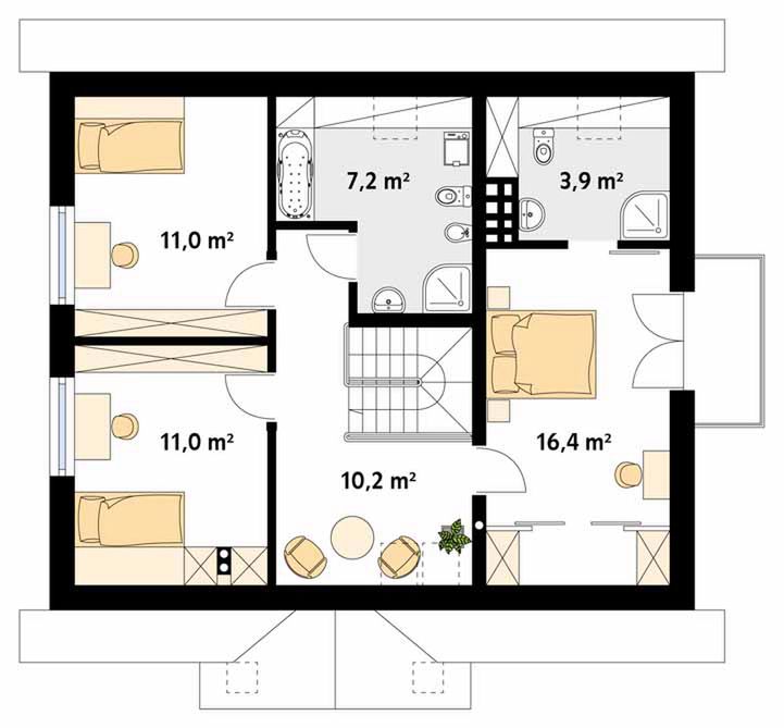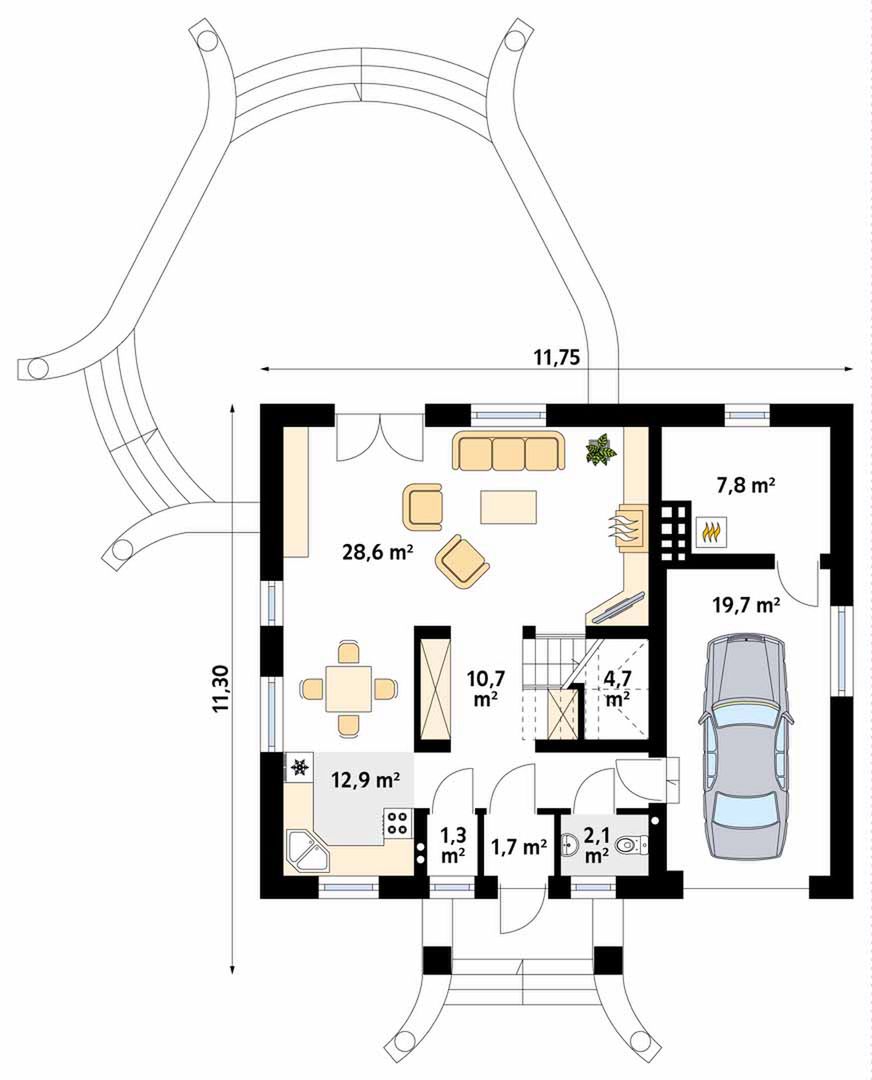 Graficzne opracowanie rzutów poglądowych widocznych na karcie projektu zostało wykonane przez Extradom.pl. Prezentowane przez Extradom.pl wizualizacje wykonane zostały przez autora projektu i należy poczytywać je jedynie za przykład i propozycję wykończenia, wizję architektoniczną autora projektu. Ostateczne wykończenie budynku może nastąpić na wiele sposobów. Szczegółowe rozwiązania zastosowane w oferowanej dokumentacji - w tym również ilość, lokalizacje i wygląd okien, drzwi, kominów - mogą w niewielkim stopniu różnić się od prezentowanej wizualizacji budynku.