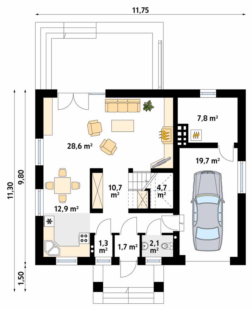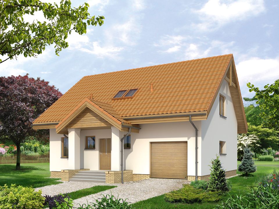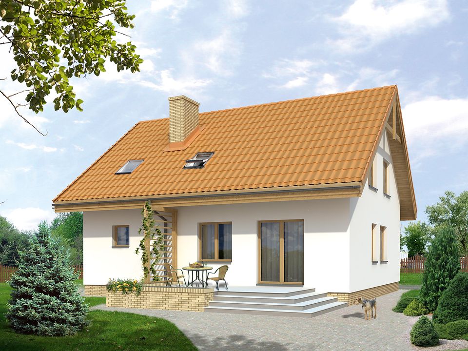 Graficzne opracowanie rzutów poglądowych widocznych na karcie projektu zostało wykonane przez Extradom.pl. Prezentowane przez Extradom.pl wizualizacje wykonane zostały przez autora projektu i należy poczytywać je jedynie za przykład i propozycję wykończenia, wizję architektoniczną autora projektu. Ostateczne wykończenie budynku może nastąpić na wiele sposobów. Szczegółowe rozwiązania zastosowane w oferowanej dokumentacji - w tym również ilość, lokalizacje i wygląd okien, drzwi, kominów - mogą w niewielkim stopniu różnić się od prezentowanej wizualizacji budynku.