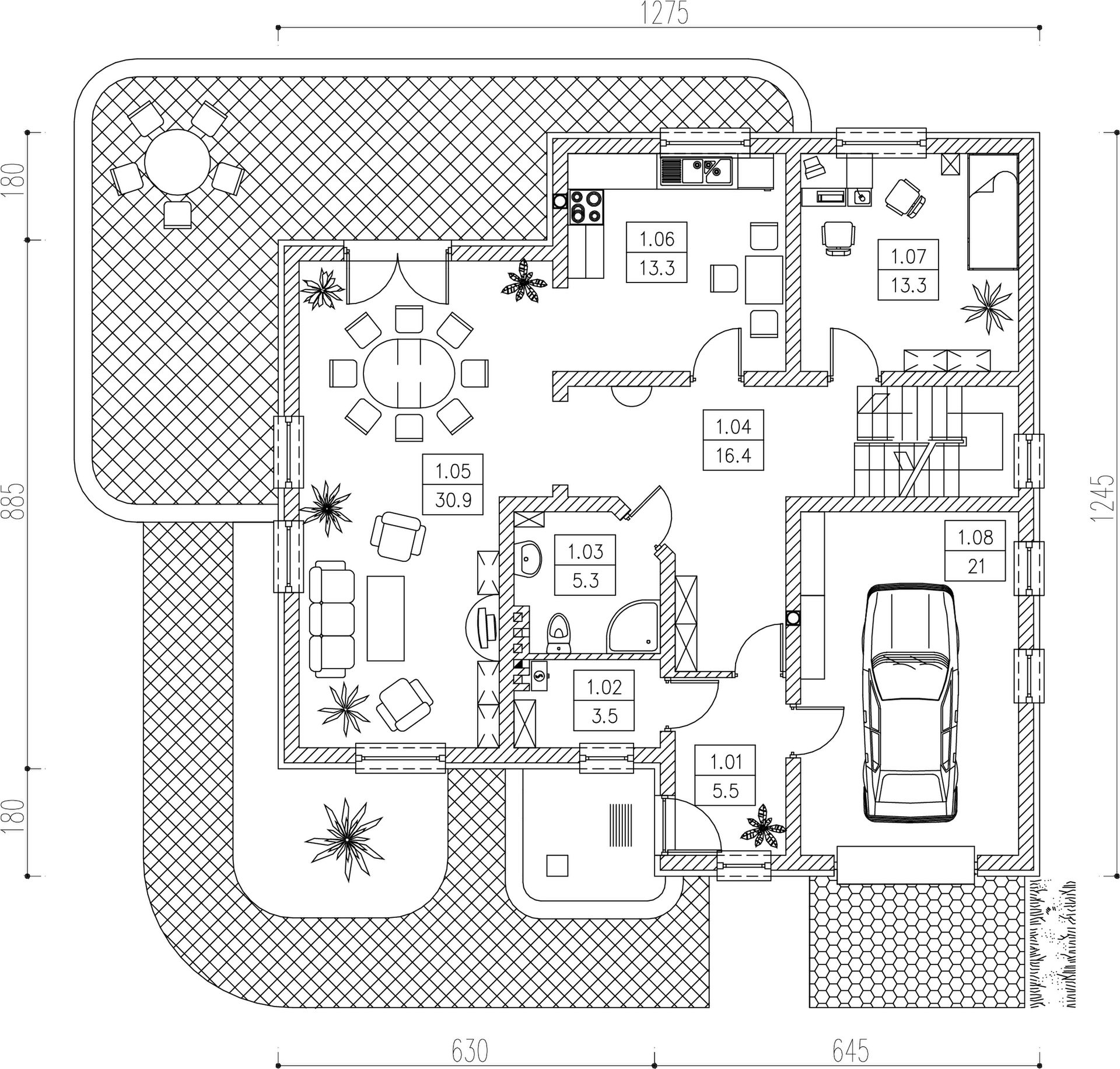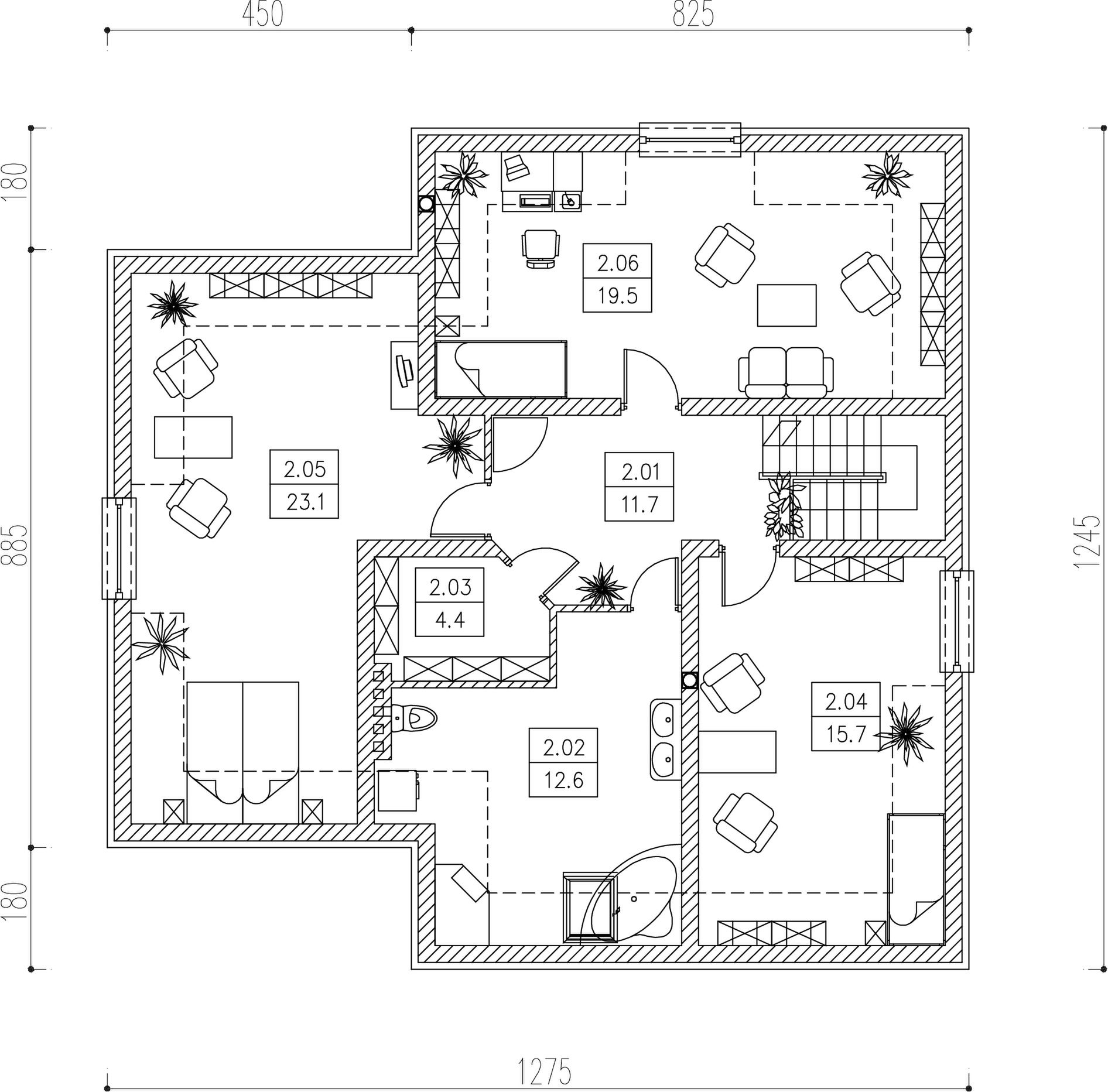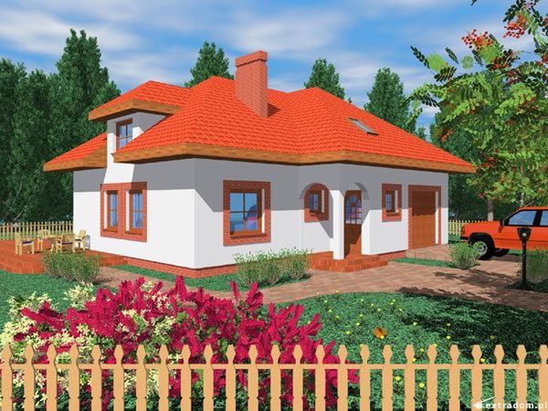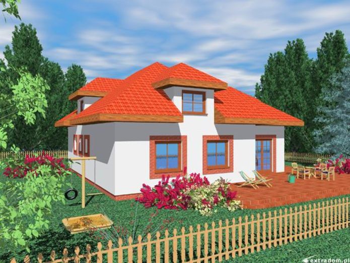 Graficzne opracowanie rzutów poglądowych widocznych na karcie projektu zostało wykonane przez Extradom.pl. Prezentowane przez Extradom.pl wizualizacje wykonane zostały przez autora projektu i należy poczytywać je jedynie za przykład i propozycję wykończenia, wizję architektoniczną autora projektu. Ostateczne wykończenie budynku może nastąpić na wiele sposobów. Szczegółowe rozwiązania zastosowane w oferowanej dokumentacji - w tym również ilość, lokalizacje i wygląd okien, drzwi, kominów - mogą w niewielkim stopniu różnić się od prezentowanej wizualizacji budynku.