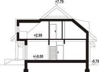 Wysokość ścianki kolankowej: 0.79 m. Strop: drewniany. Pokrycie dachu: dachówka gontopodobna Gerard Corona. Ściany zewnętrzne: płazy drewniane + wełna mineralna + deska. Ściany wewnętrzne: płazy drewniane. Typ ogrzewania: kocioł gazowy lub kocioł na paliwo stałe. Instalacje dodatkowe: instalacja solarna. Inne: okna połaciowe Velux, brama garażowa Hörmann.