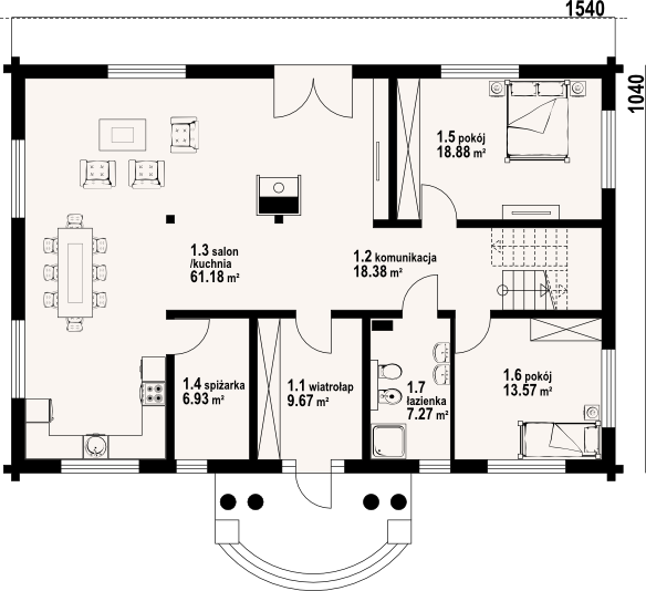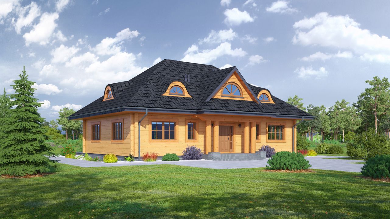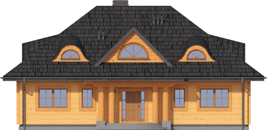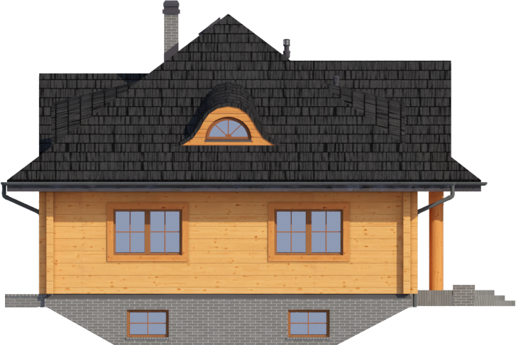 Graficzne opracowanie rzutów poglądowych widocznych na karcie projektu zostało wykonane przez Extradom.pl. Prezentowane przez Extradom.pl wizualizacje wykonane zostały przez autora projektu i należy poczytywać je jedynie za przykład i propozycję wykończenia, wizję architektoniczną autora projektu. Ostateczne wykończenie budynku może nastąpić na wiele sposobów. Szczegółowe rozwiązania zastosowane w oferowanej dokumentacji - w tym również ilość, lokalizacje i wygląd okien, drzwi, kominów - mogą w niewielkim stopniu różnić się od prezentowanej wizualizacji budynku.