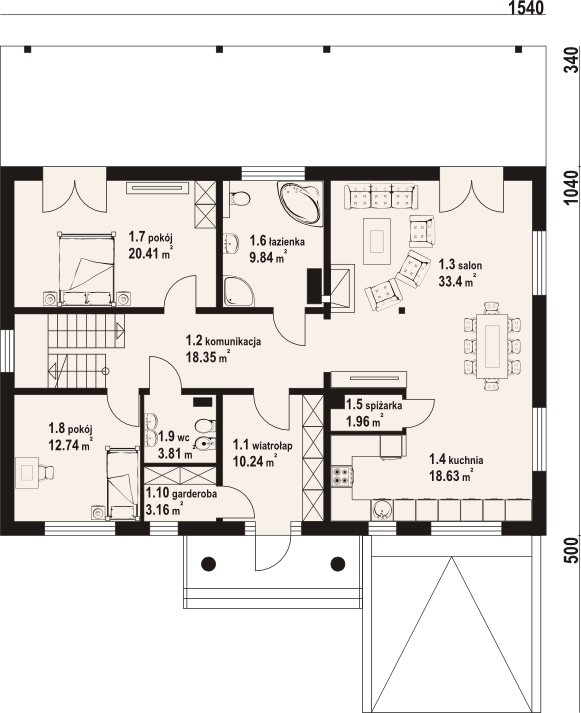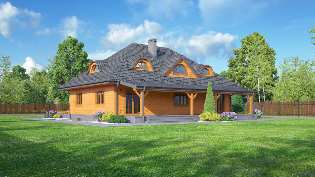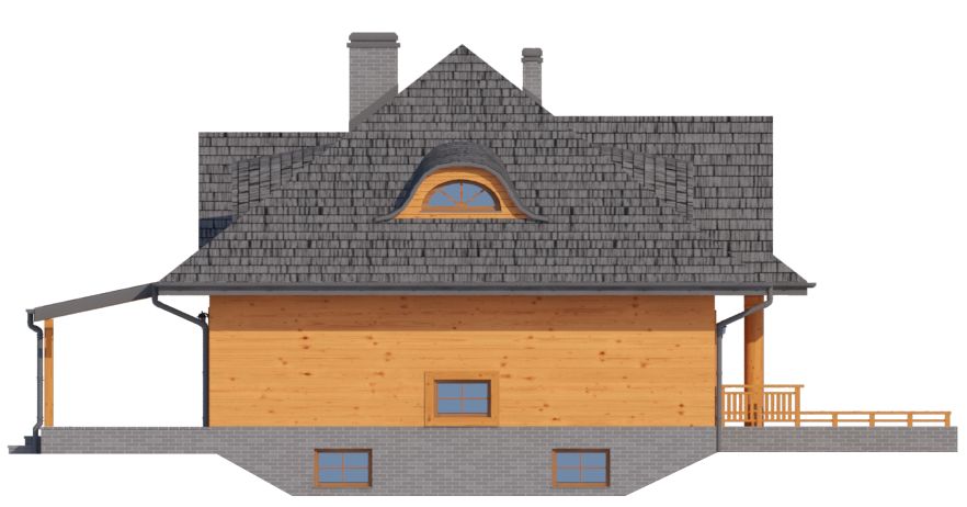 Graficzne opracowanie rzutów poglądowych widocznych na karcie projektu zostało wykonane przez Extradom.pl. Prezentowane przez Extradom.pl wizualizacje wykonane zostały przez autora projektu i należy poczytywać je jedynie za przykład i propozycję wykończenia, wizję architektoniczną autora projektu. Ostateczne wykończenie budynku może nastąpić na wiele sposobów. Szczegółowe rozwiązania zastosowane w oferowanej dokumentacji - w tym również ilość, lokalizacje i wygląd okien, drzwi, kominów - mogą w niewielkim stopniu różnić się od prezentowanej wizualizacji budynku.
