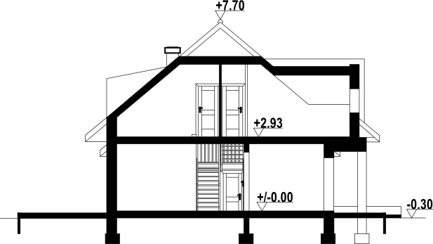 Wysokość ścianki kolankowej: 0.73 m. Strop: płyta żelbetowa. Pokrycie dachu: dachówka gontopodobna Gerard Corona. Ściany zewnętrzne: pustaki ceramiczne + styropian. Ściany wewnętrzne: pustaki ceramiczne. Typ ogrzewania: kocioł gazowy lub kocioł na paliwo stałe.