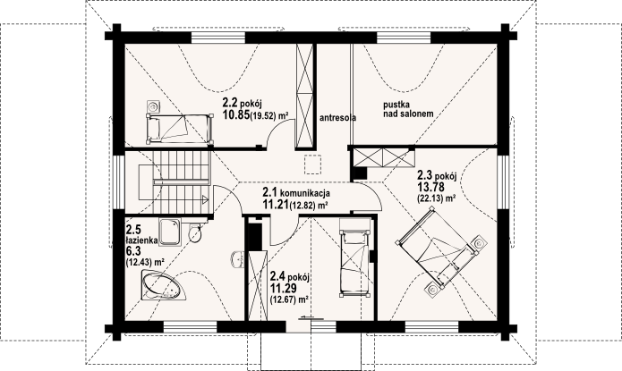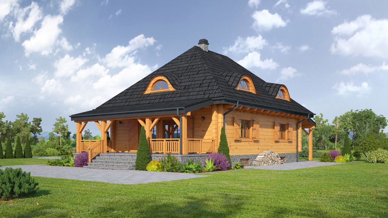Wysokość ścianki kolankowej: 0.88 m. Strop: drewniany. Pokrycie dachu: dachówka gontopodobna Gerard Corona. Ściany zewnętrzne: płazy drewniane + wełna mineralna + deska. Ściany wewnętrzne: płazy drewniane. Typ ogrzewania: kocioł gazowy lub kocioł na paliwo stałe.