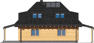 Wysokość ścianki kolankowej: 0.83 m. Strop: drewniany. Pokrycie dachu: dachówka gontopodobna Gerard Corona. Ściany zewnętrzne: płazy drewniane + wełna mineralna + deska. Ściany wewnętrzne: płazy drewniane. Typ ogrzewania: kocioł gazowy. Instalacje dodatkowe: instalacja solarna. Inne: okna połaciowe Velux.