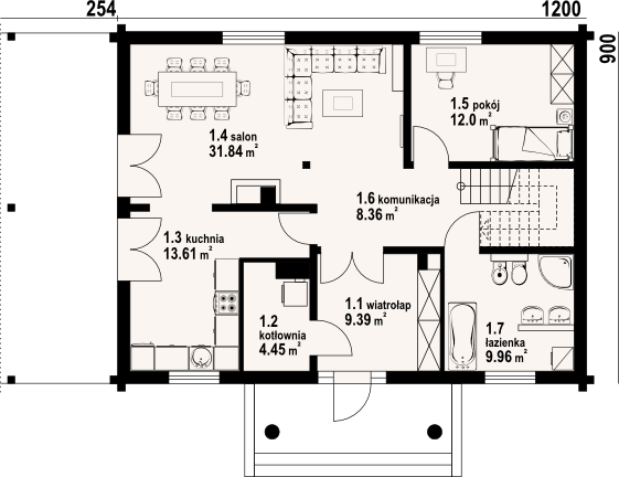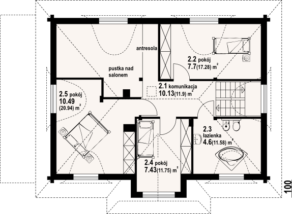 Graficzne opracowanie rzutów poglądowych widocznych na karcie projektu zostało wykonane przez Extradom.pl. Prezentowane przez Extradom.pl wizualizacje wykonane zostały przez autora projektu i należy poczytywać je jedynie za przykład i propozycję wykończenia, wizję architektoniczną autora projektu. Ostateczne wykończenie budynku może nastąpić na wiele sposobów. Szczegółowe rozwiązania zastosowane w oferowanej dokumentacji - w tym również ilość, lokalizacje i wygląd okien, drzwi, kominów - mogą w niewielkim stopniu różnić się od prezentowanej wizualizacji budynku.