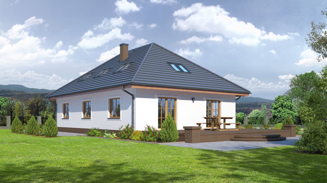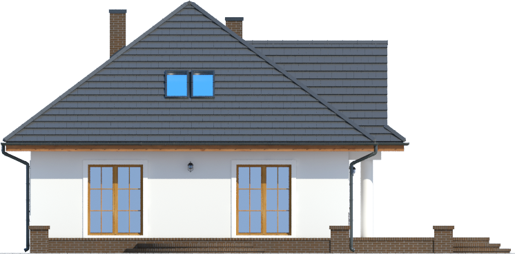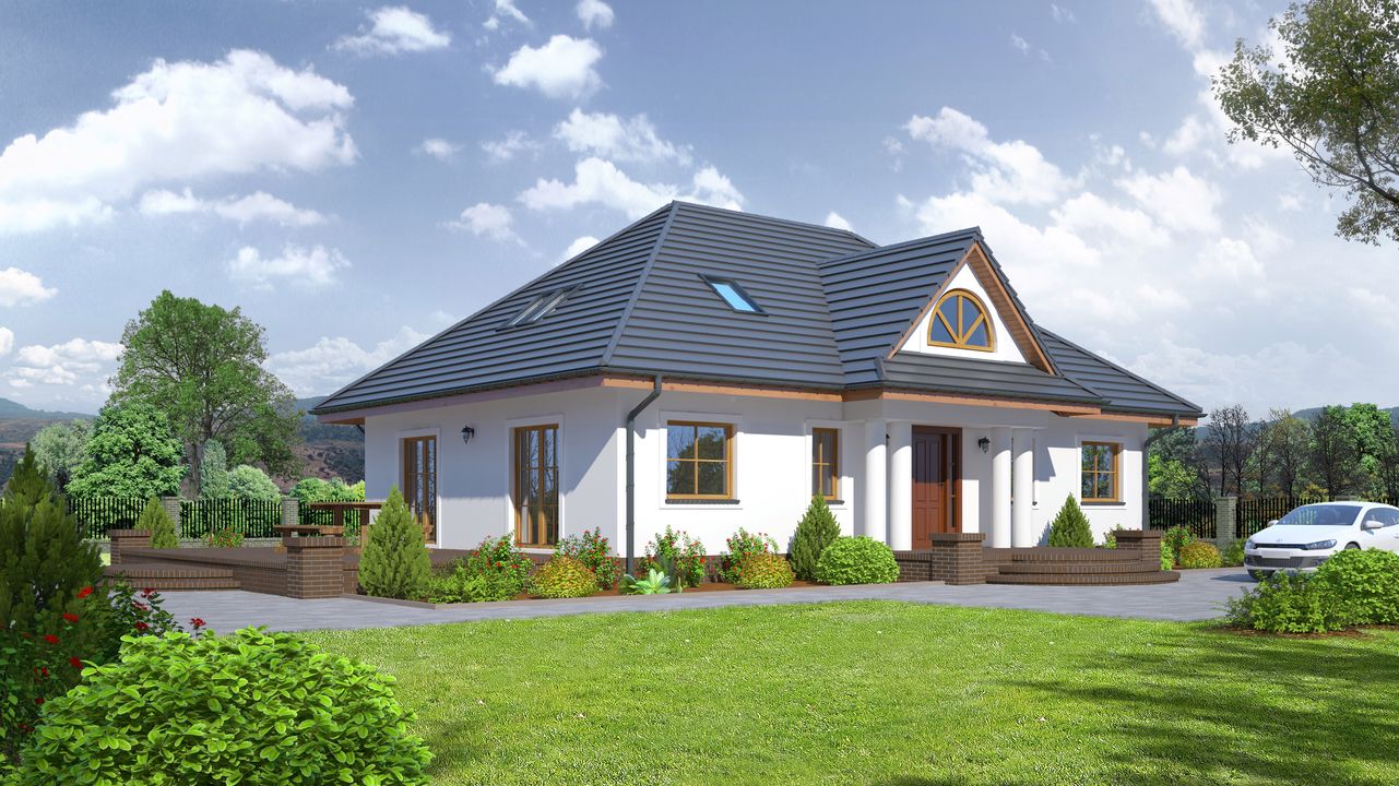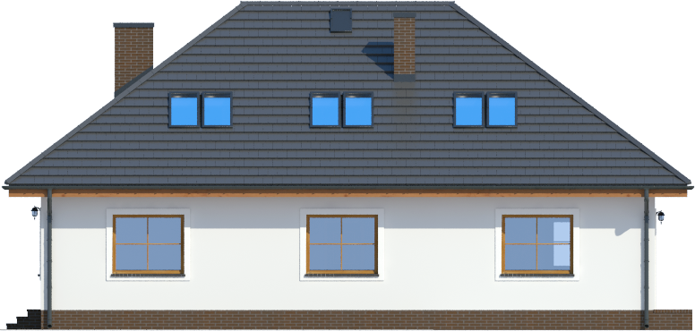 Graficzne opracowanie rzutów poglądowych widocznych na karcie projektu zostało wykonane przez Extradom.pl. Prezentowane przez Extradom.pl wizualizacje wykonane zostały przez autora projektu i należy poczytywać je jedynie za przykład i propozycję wykończenia, wizję architektoniczną autora projektu. Ostateczne wykończenie budynku może nastąpić na wiele sposobów. Szczegółowe rozwiązania zastosowane w oferowanej dokumentacji - w tym również ilość, lokalizacje i wygląd okien, drzwi, kominów - mogą w niewielkim stopniu różnić się od prezentowanej wizualizacji budynku.