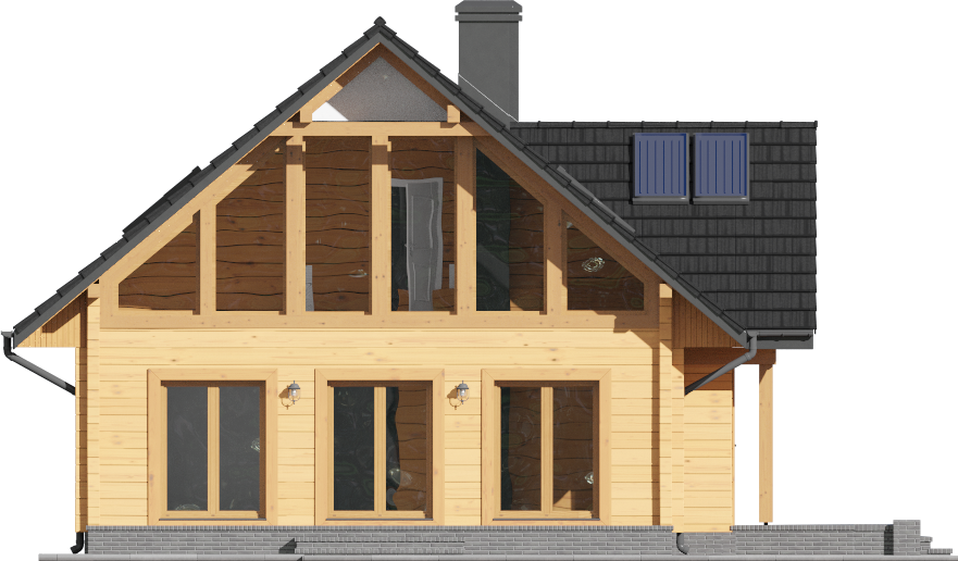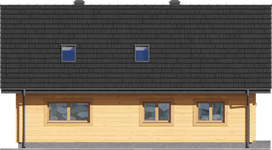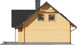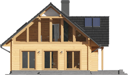 Wysokość ścianki kolankowej: 0.67 m. Strop: drewniany. Pokrycie dachu: dachówka gontopodobna Gerard Corona. Ściany zewnętrzne: płazy drewniane + wełna mineralna + deska. Ściany wewnętrzne: płazy drewniane. Typ ogrzewania: kocioł gazowy. Instalacje dodatkowe: instalacja solarna. Inne: okna połaciowe Velux.