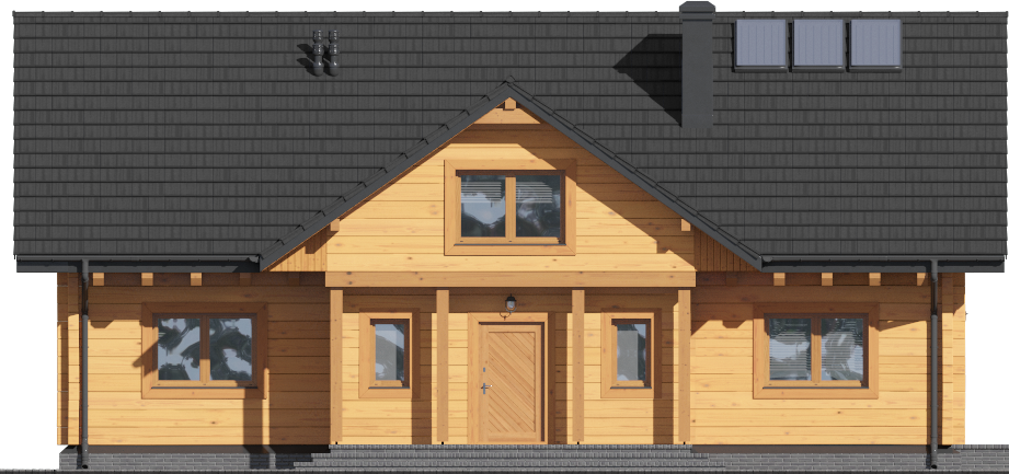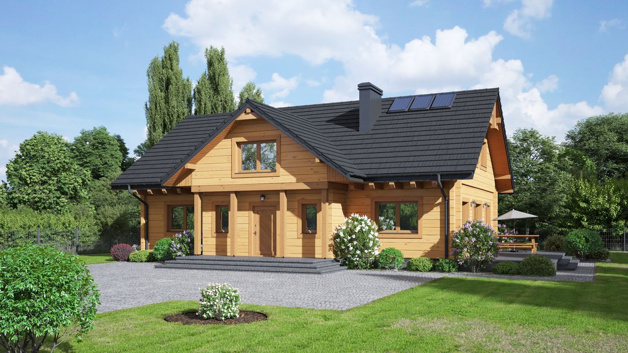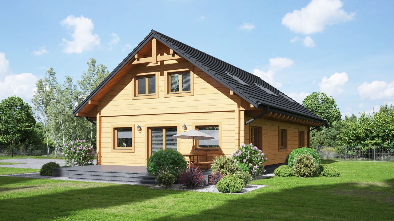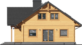 Wysokość ścianki kolankowej: 0.73 m. Strop: żelbet + drewniany. Pokrycie dachu: dachówka gontopodobna Gerard Corona. Ściany zewnętrzne: płazy drewniane + wełna mineralna + deska. Ściany wewnętrzne: płazy drewniane. Typ ogrzewania: kocioł gazowy lub kocioł na paliwo stałe. Instalacje dodatkowe: instalacja solarna. Inne: okna połaciowe Velux.