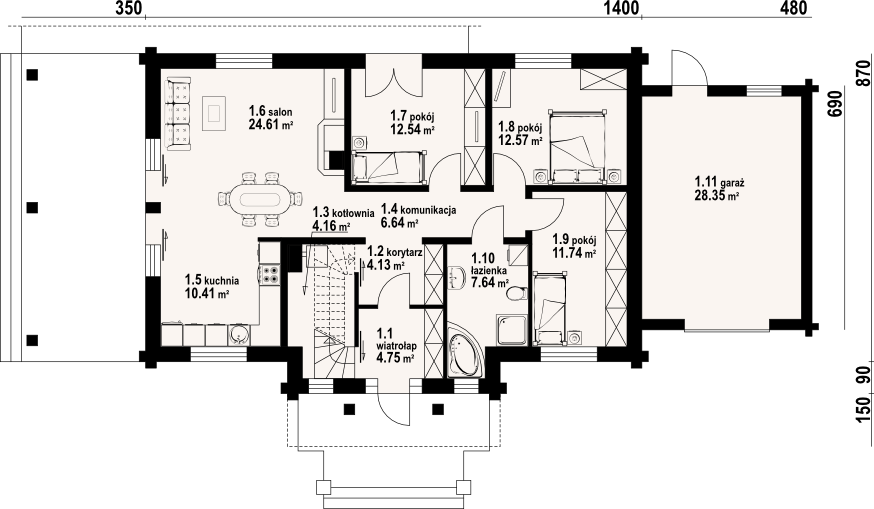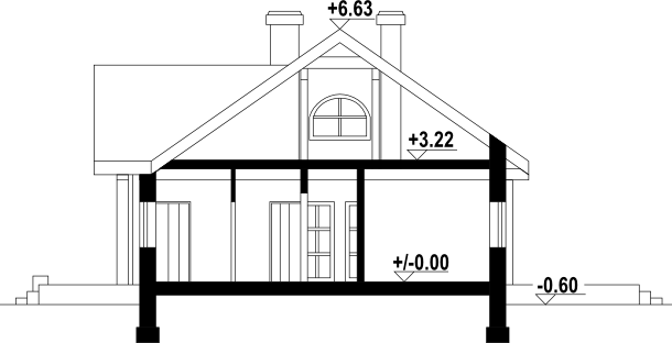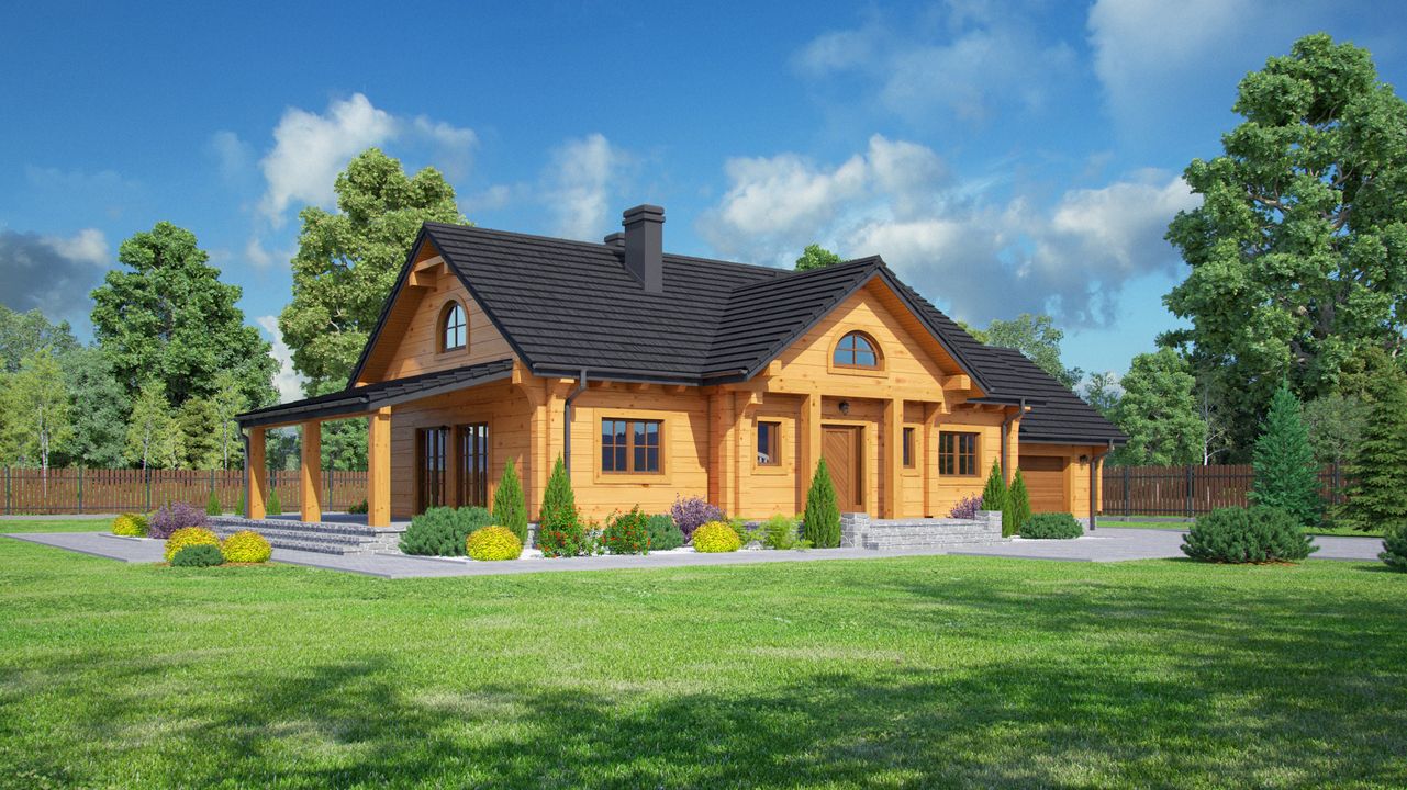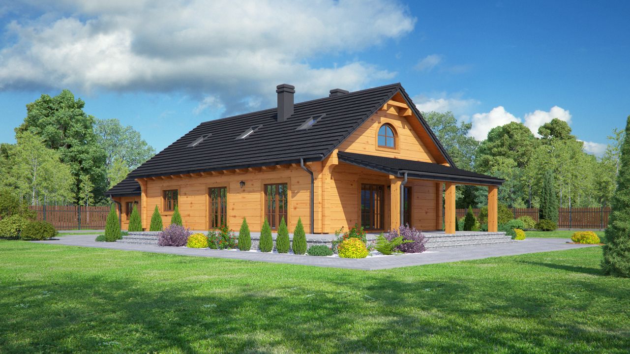 Wysokość ścianki kolankowej: 0.38 m. Strop: drewniany. Pokrycie dachu: dachówka gontopodobna Gerard Corona. Ściany zewnętrzne: płazy drewniane + wełna mineralna + deska. Ściany wewnętrzne: płazy drewniane. Typ ogrzewania: kocioł gazowy. Inne: okna połaciowe Velux, brama garażowa Hörmann.