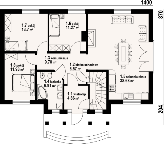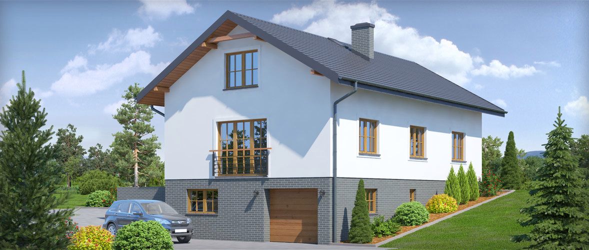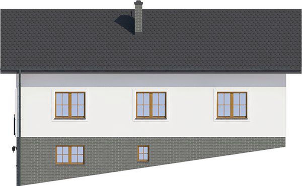 Graficzne opracowanie rzutów poglądowych widocznych na karcie projektu zostało wykonane przez Extradom.pl. Prezentowane przez Extradom.pl wizualizacje wykonane zostały przez autora projektu i należy poczytywać je jedynie za przykład i propozycję wykończenia, wizję architektoniczną autora projektu. Ostateczne wykończenie budynku może nastąpić na wiele sposobów. Szczegółowe rozwiązania zastosowane w oferowanej dokumentacji - w tym również ilość, lokalizacje i wygląd okien, drzwi, kominów - mogą w niewielkim stopniu różnić się od prezentowanej wizualizacji budynku.