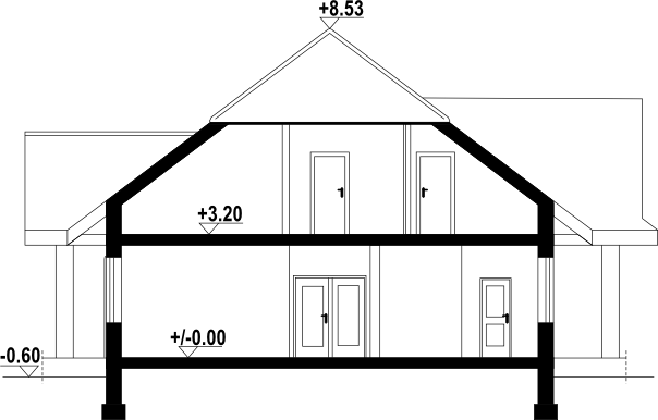Wysokość ścianki kolankowej: 0.72 m. Strop: płyta żelbetowa. Pokrycie dachu: dachówka ceramiczna. Ściany zewnętrzne: pustaki ceramiczne + styropian. Ściany wewnętrzne: pustaki ceramiczne. Typ ogrzewania: kocioł gazowy.