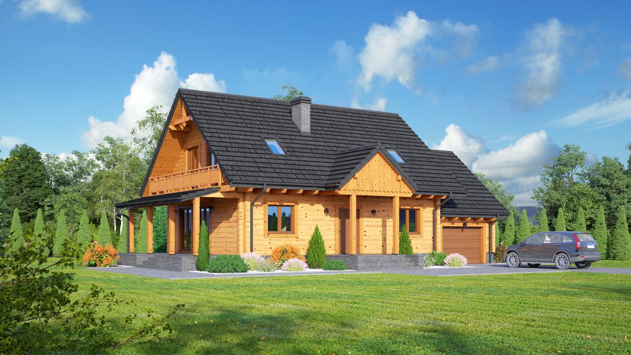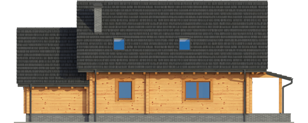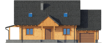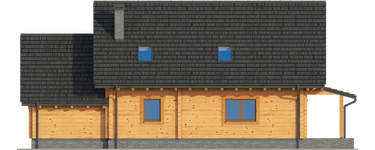 Wysokość ścianki kolankowej: 0.92 m. Strop: drewniany. Pokrycie dachu: dachówka gontopodobna Gerard Corona. Ściany zewnętrzne: płazy drewniane + wełna mineralna + deska. Ściany wewnętrzne: płazy drewniane. Typ ogrzewania: kocioł gazowy. Inne: okna połaciowe Velux.