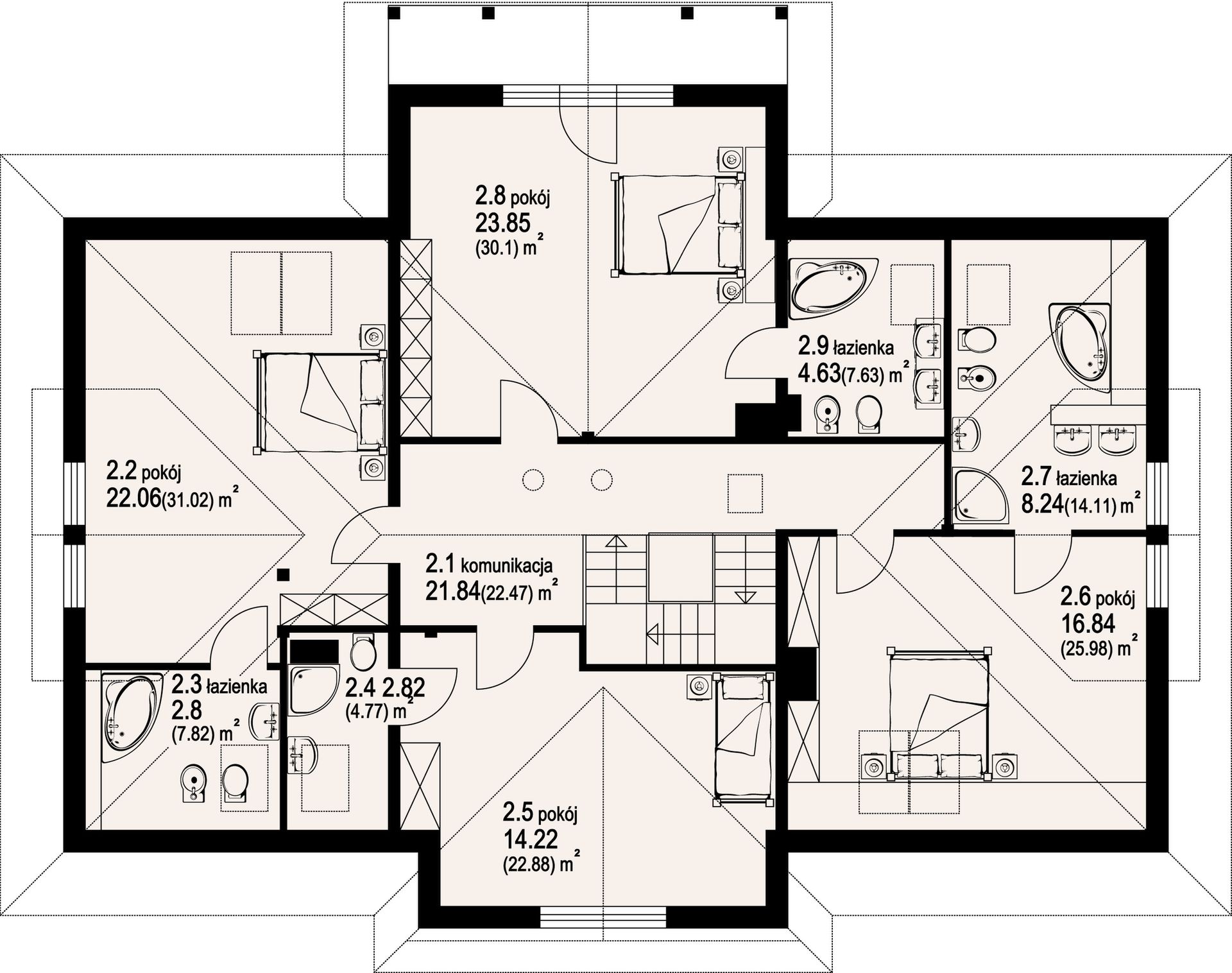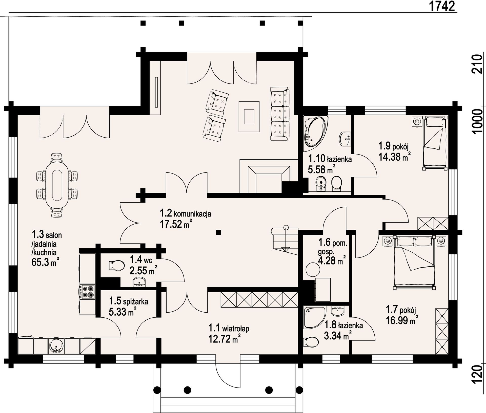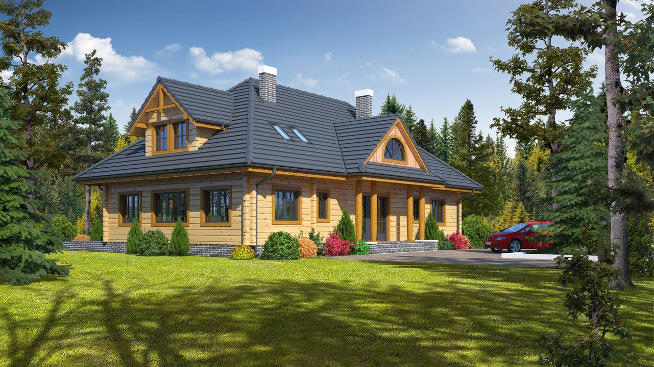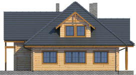 Graficzne opracowanie rzutów poglądowych widocznych na karcie projektu zostało wykonane przez Extradom.pl. Prezentowane przez Extradom.pl wizualizacje wykonane zostały przez autora projektu i należy poczytywać je jedynie za przykład i propozycję wykończenia, wizję architektoniczną autora projektu. Ostateczne wykończenie budynku może nastąpić na wiele sposobów. Szczegółowe rozwiązania zastosowane w oferowanej dokumentacji - w tym również ilość, lokalizacje i wygląd okien, drzwi, kominów - mogą w niewielkim stopniu różnić się od prezentowanej wizualizacji budynku.