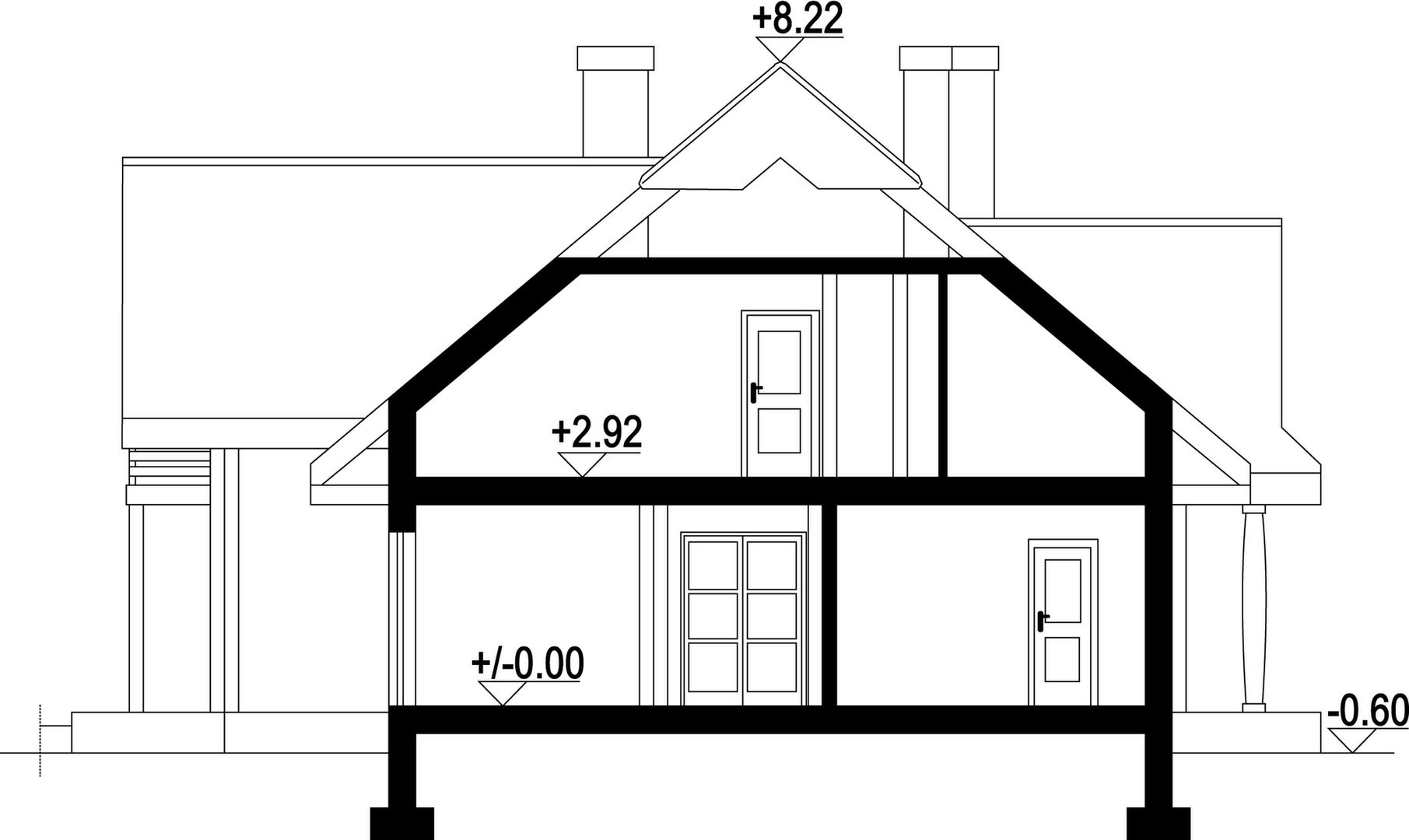 Wys. ścianki kolankowej 0.82 m. Strop: drewniany. Pokrycie dachu: dachówka gontopodobna z posypką Gerard Corona. Ściany wewnętrzne: płazy drewniane. Ściany zewnętrzne: płazy drewniane + wełna mineralna + deska. Typ ogrzewania: kocioł gazowy.
