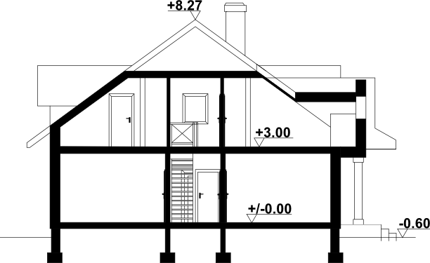 Wysokość ścianki kolankowej: 0.77 m. Strop: płyta żelbetowa. Pokrycie dachu: dachówka gontopodobna Gerard Corona. Ściany zewnętrzne: pustaki ceramiczne + styropian. Ściany wewnętrzne: pustaki ceramiczne. Typ ogrzewania: kocioł gazowy lub kocioł na paliwo stałe.