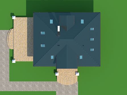 Graficzne opracowanie rzutów poglądowych widocznych na karcie projektu zostało wykonane przez Extradom.pl. Prezentowane przez Extradom.pl wizualizacje wykonane zostały przez autora projektu i należy poczytywać je jedynie za przykład i propozycję wykończenia, wizję architektoniczną autora projektu. Ostateczne wykończenie budynku może nastąpić na wiele sposobów. Szczegółowe rozwiązania zastosowane w oferowanej dokumentacji - w tym również ilość, lokalizacje i wygląd okien, drzwi, kominów - mogą w niewielkim stopniu różnić się od prezentowanej wizualizacji budynku.
