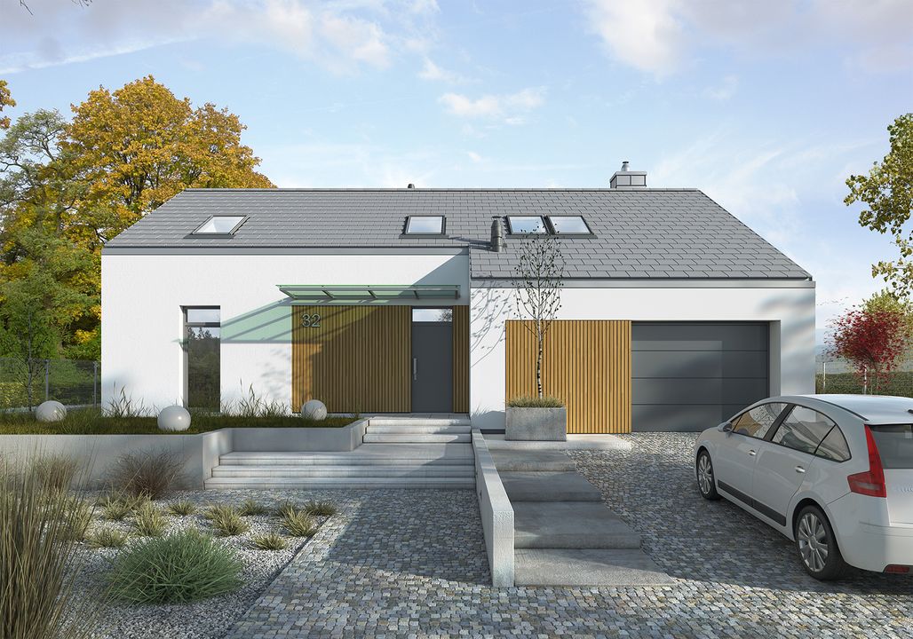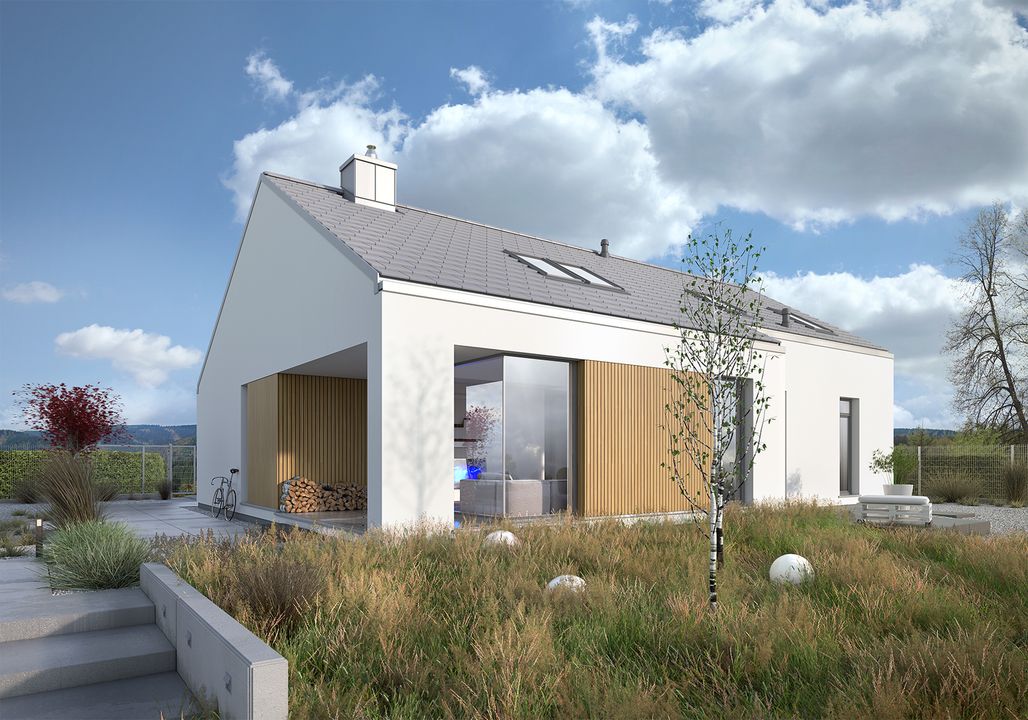 Graficzne opracowanie rzutów poglądowych widocznych na karcie projektu zostało wykonane przez Extradom.pl. Prezentowane przez Extradom.pl wizualizacje wykonane zostały przez autora projektu i należy poczytywać je jedynie za przykład i propozycję wykończenia, wizję architektoniczną autora projektu. Ostateczne wykończenie budynku może nastąpić na wiele sposobów. Szczegółowe rozwiązania zastosowane w oferowanej dokumentacji - w tym również ilość, lokalizacje i wygląd okien, drzwi, kominów - mogą w niewielkim stopniu różnić się od prezentowanej wizualizacji budynku.
