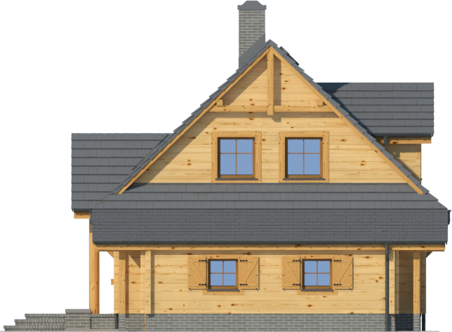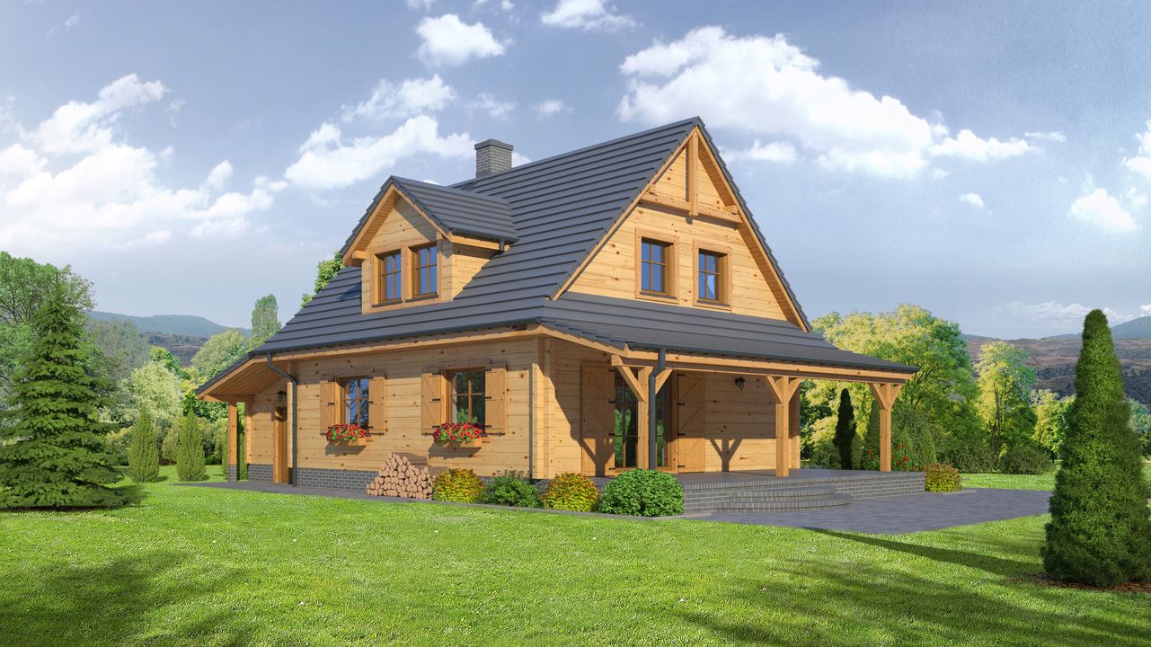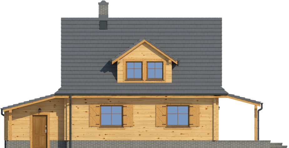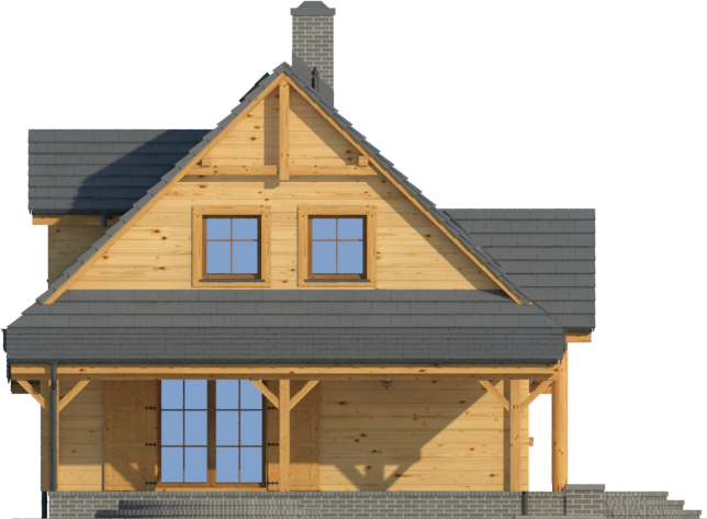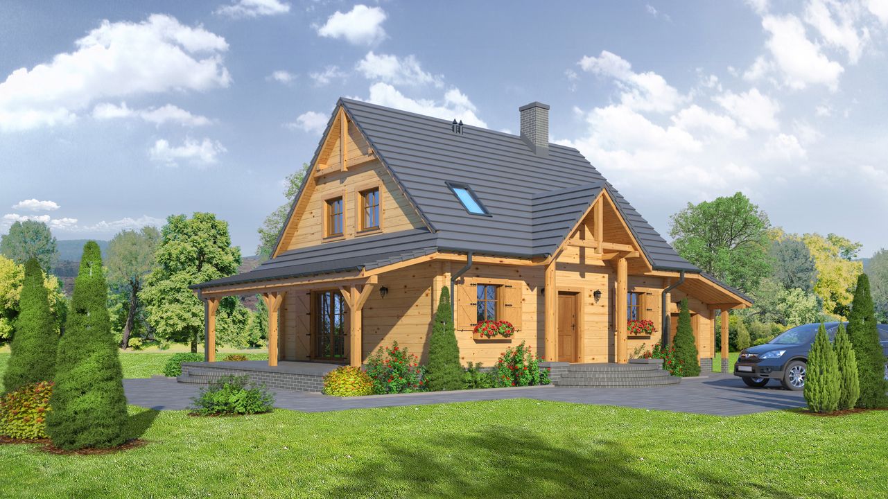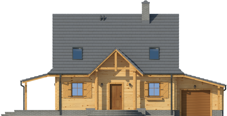 Wysokość ścianki kolankowej: 0.57 m. Strop: drewniany. Pokrycie dachu: dachówka gontopodobna Gerard Corona. Ściany zewnętrzne: płazy drewniane + wełna mineralna + deska. Ściany wewnętrzne: płazy drewniane. Typ ogrzewania: kocioł gazowy lub kocioł na paliwo stałe. Inne: okna połaciowe Velux.
