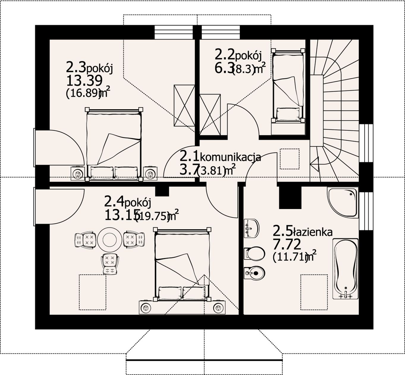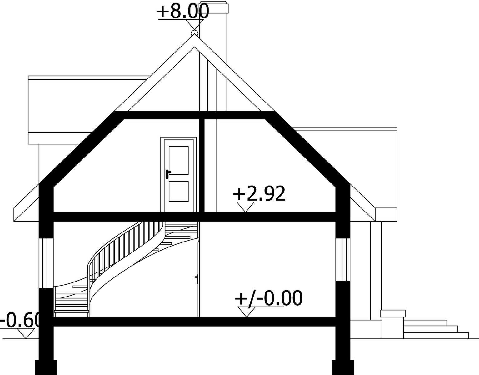 Wysokość ścianki kolankowej: 0.63 m. Strop: płyta żelbetowa. Pokrycie dachu: dachówka ceramiczna. Ściany zewnętrzne: pustaki ceramiczne + styropian. Ściany wewnętrzne: pustaki ceramiczne. Typ ogrzewania: kocioł gazowy lub kocioł na paliwo stałe. Inne: okna połaciowe Velux.