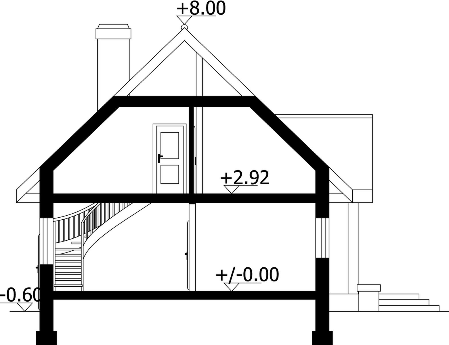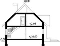 Wysokość ścianki kolankowej: 0.63 m. Strop: płyta żelbetowa. Pokrycie dachu: dachówka ceramiczna. Ściany zewnętrzne: pustaki ceramiczne + styropian. Ściany wewnętrzne: pustaki ceramiczne. Typ ogrzewania: kocioł gazowy lub kocioł na paliwo stałe. Inne: okna połaciowe Velux.