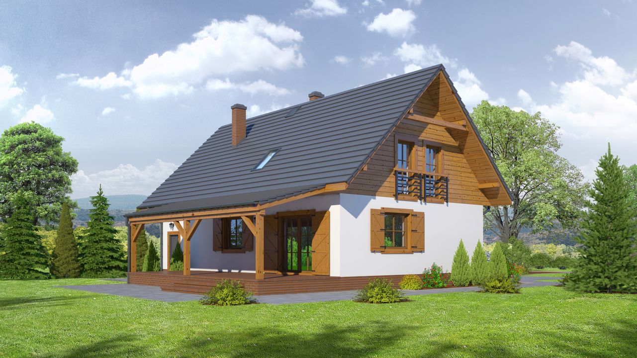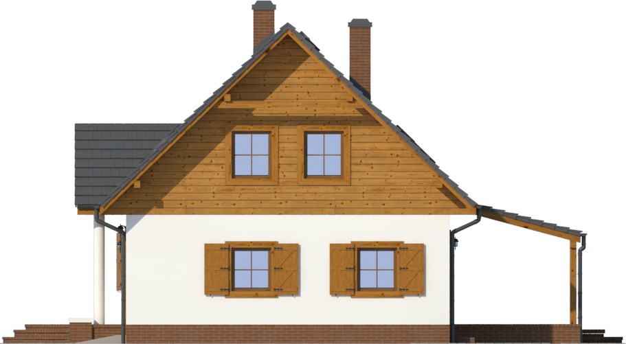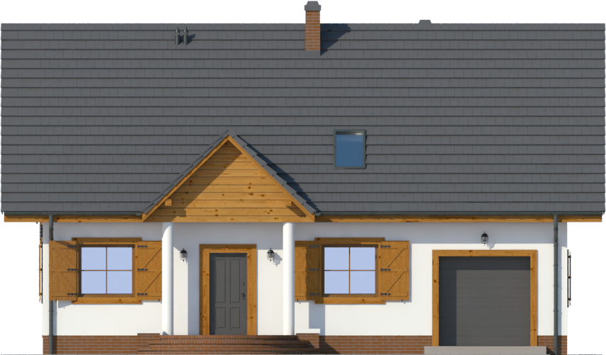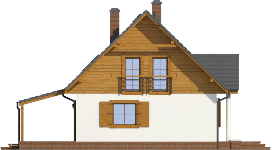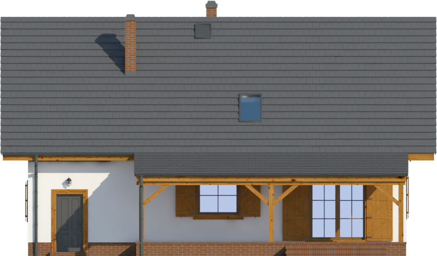 Graficzne opracowanie rzutów poglądowych widocznych na karcie projektu zostało wykonane przez Extradom.pl. Prezentowane przez Extradom.pl wizualizacje wykonane zostały przez autora projektu i należy poczytywać je jedynie za przykład i propozycję wykończenia, wizję architektoniczną autora projektu. Ostateczne wykończenie budynku może nastąpić na wiele sposobów. Szczegółowe rozwiązania zastosowane w oferowanej dokumentacji - w tym również ilość, lokalizacje i wygląd okien, drzwi, kominów - mogą w niewielkim stopniu różnić się od prezentowanej wizualizacji budynku.