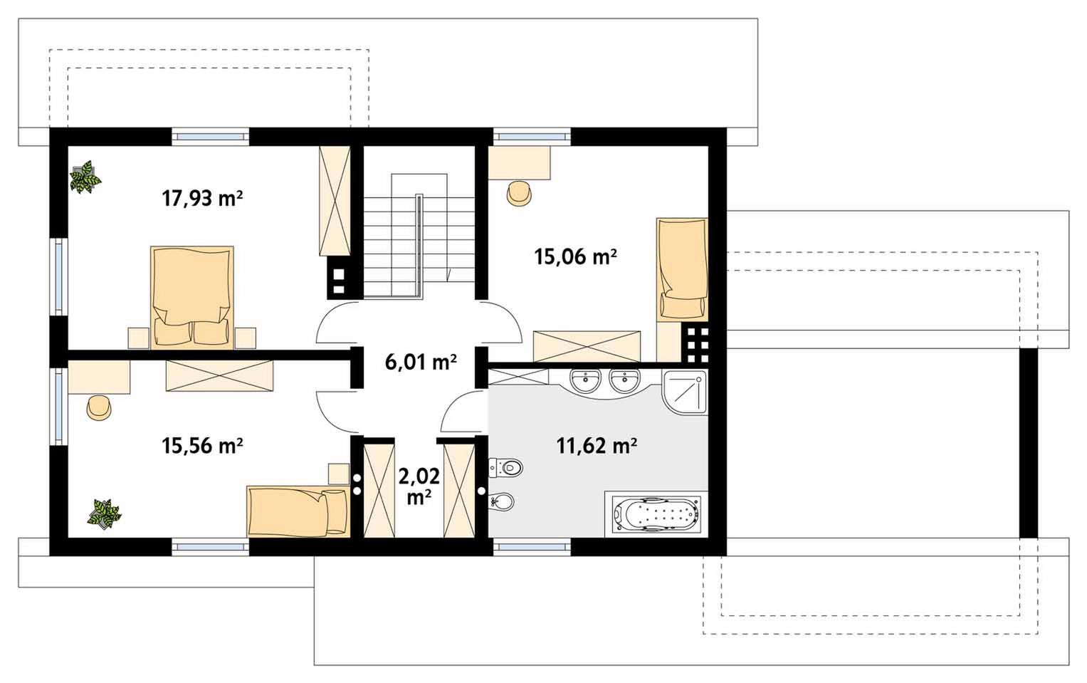 Graficzne opracowanie rzutów poglądowych widocznych na karcie projektu zostało wykonane przez Extradom.pl. Prezentowane przez Extradom.pl wizualizacje wykonane zostały przez autora projektu i należy poczytywać je jedynie za przykład i propozycję wykończenia, wizję architektoniczną autora projektu. Ostateczne wykończenie budynku może nastąpić na wiele sposobów. Szczegółowe rozwiązania zastosowane w oferowanej dokumentacji - w tym również ilość, lokalizacje i wygląd okien, drzwi, kominów - mogą w niewielkim stopniu różnić się od prezentowanej wizualizacji budynku.