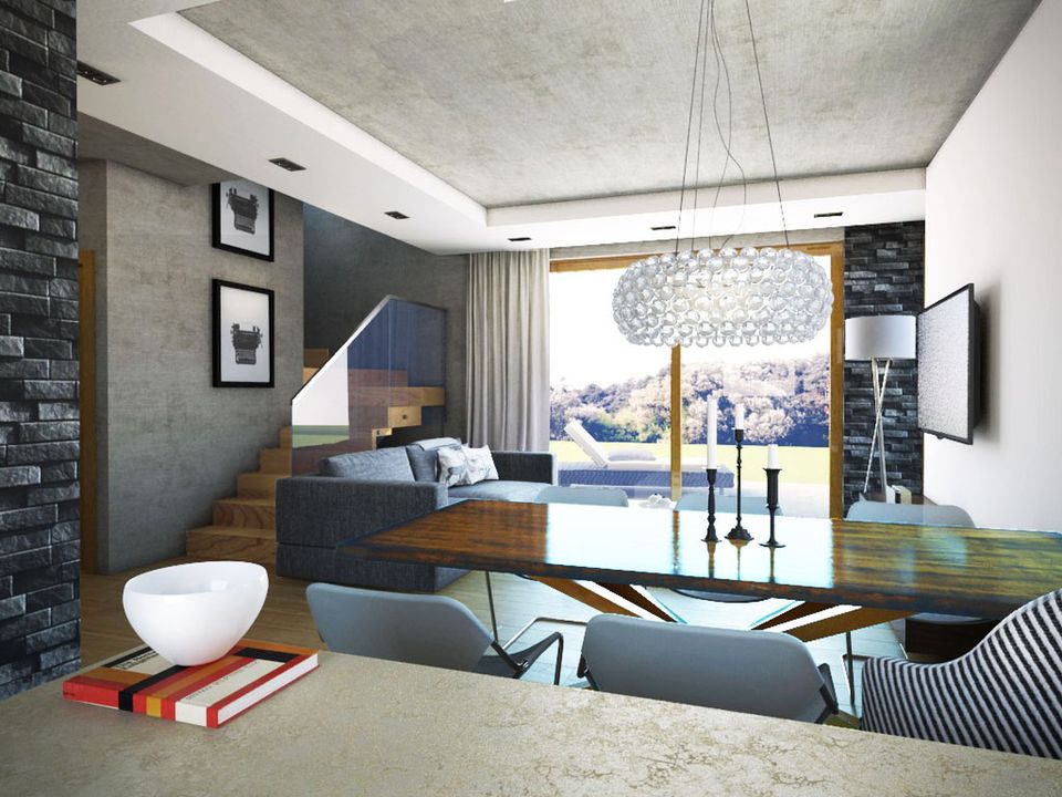 Graficzne opracowanie rzutów poglądowych widocznych na karcie projektu zostało wykonane przez Extradom.pl. Prezentowane przez Extradom.pl wizualizacje wykonane zostały przez autora projektu i należy poczytywać je jedynie za przykład i propozycję wykończenia, wizję architektoniczną autora projektu. Ostateczne wykończenie budynku może nastąpić na wiele sposobów. Szczegółowe rozwiązania zastosowane w oferowanej dokumentacji - w tym również ilość, lokalizacje i wygląd okien, drzwi, kominów - mogą w niewielkim stopniu różnić się od prezentowanej wizualizacji budynku.