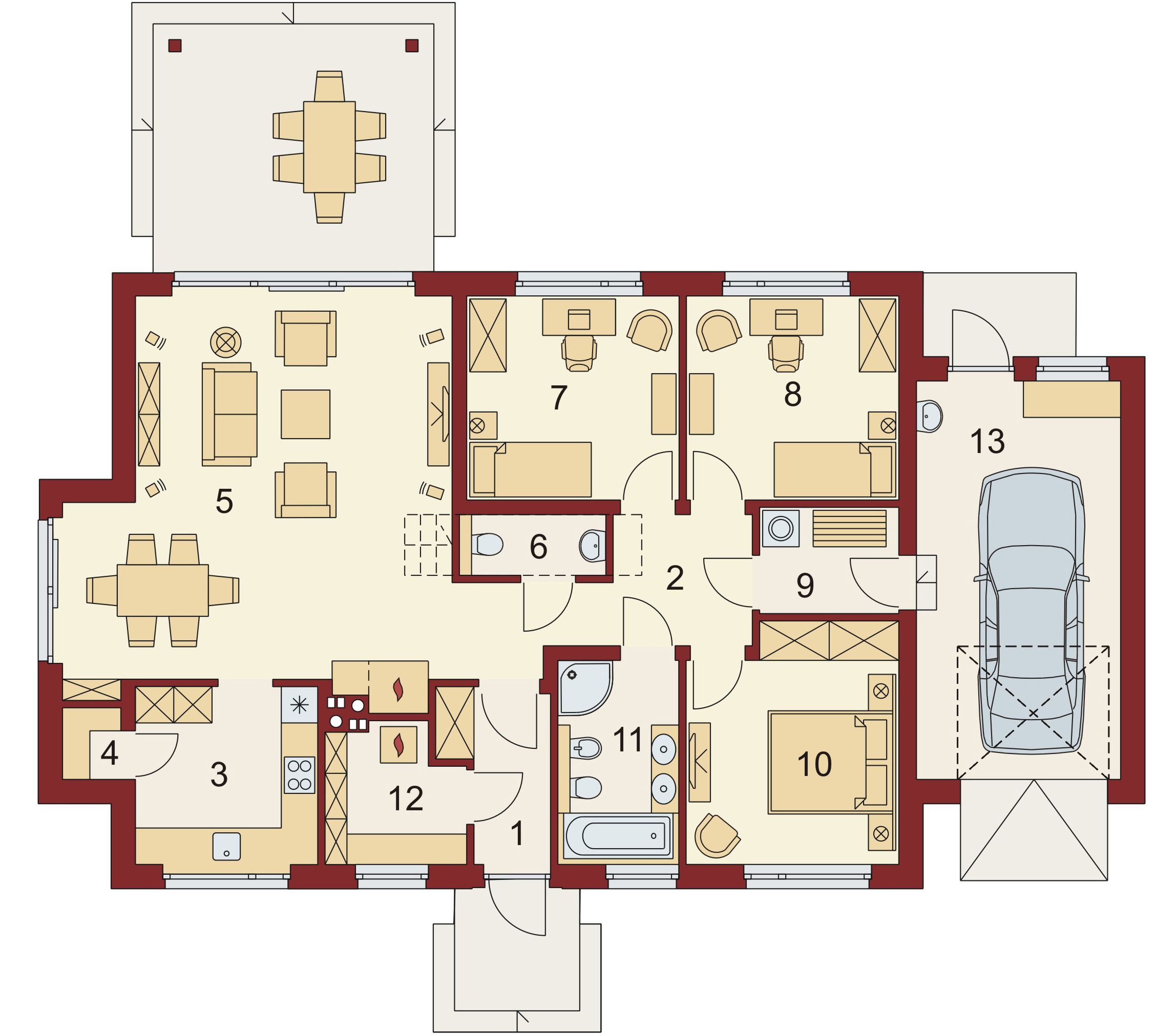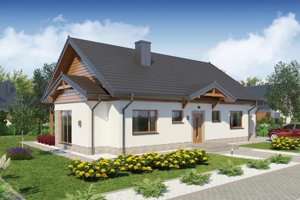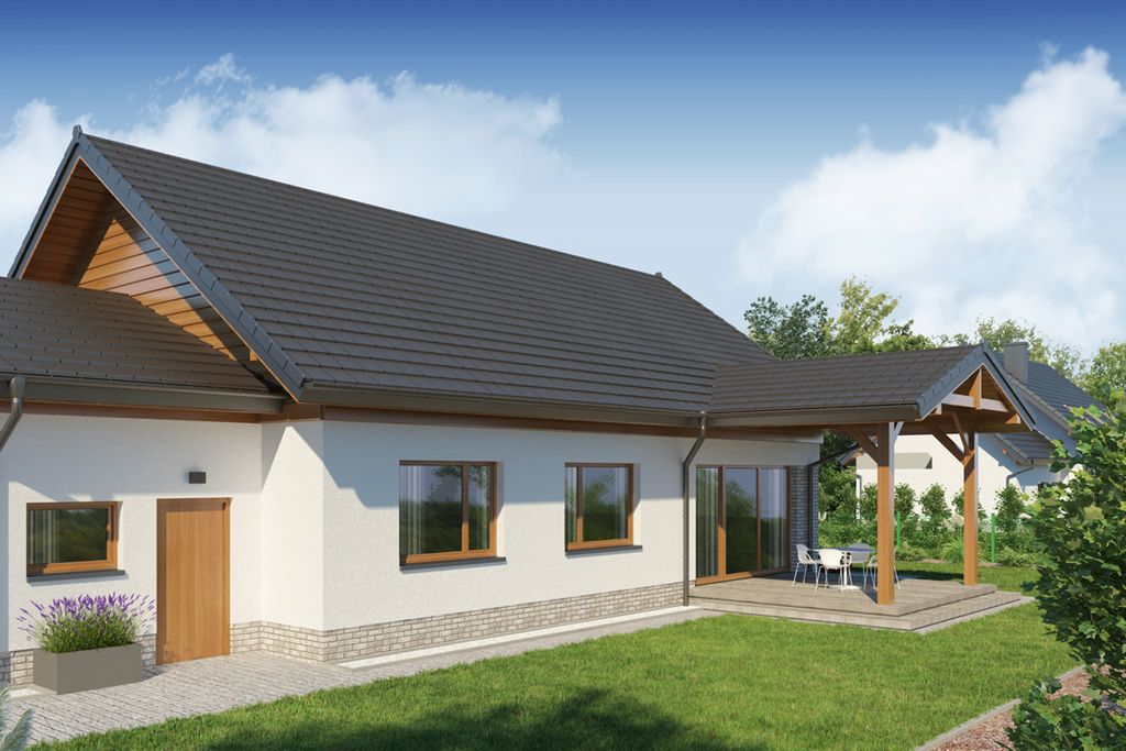 Graficzne opracowanie rzutów poglądowych widocznych na karcie projektu zostało wykonane przez Extradom.pl. Prezentowane przez Extradom.pl wizualizacje wykonane zostały przez autora projektu i należy poczytywać je jedynie za przykład i propozycję wykończenia, wizję architektoniczną autora projektu. Ostateczne wykończenie budynku może nastąpić na wiele sposobów. Szczegółowe rozwiązania zastosowane w oferowanej dokumentacji - w tym również ilość, lokalizacje i wygląd okien, drzwi, kominów - mogą w niewielkim stopniu różnić się od prezentowanej wizualizacji budynku.