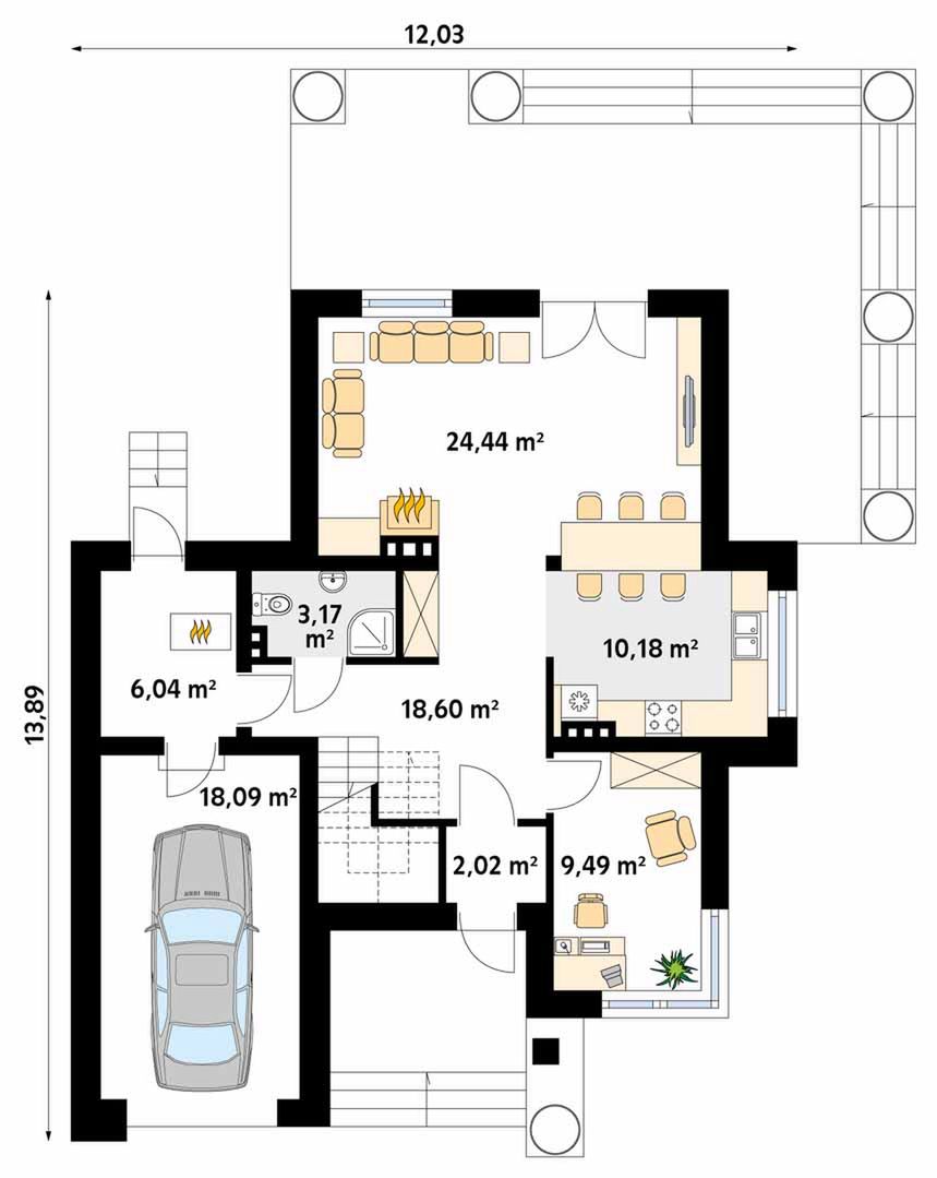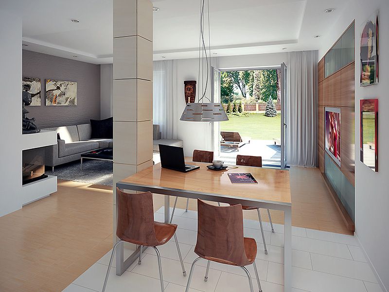 Graficzne opracowanie rzutów poglądowych widocznych na karcie projektu zostało wykonane przez Extradom.pl. Prezentowane przez Extradom.pl wizualizacje wykonane zostały przez autora projektu i należy poczytywać je jedynie za przykład i propozycję wykończenia, wizję architektoniczną autora projektu. Ostateczne wykończenie budynku może nastąpić na wiele sposobów. Szczegółowe rozwiązania zastosowane w oferowanej dokumentacji - w tym również ilość, lokalizacje i wygląd okien, drzwi, kominów - mogą w niewielkim stopniu różnić się od prezentowanej wizualizacji budynku.