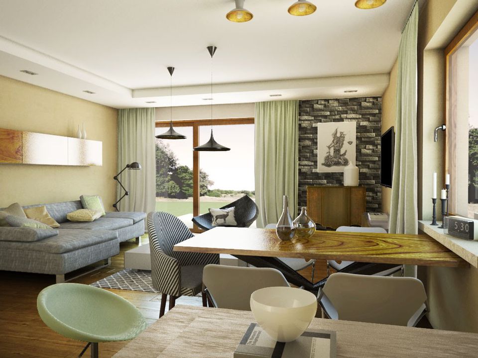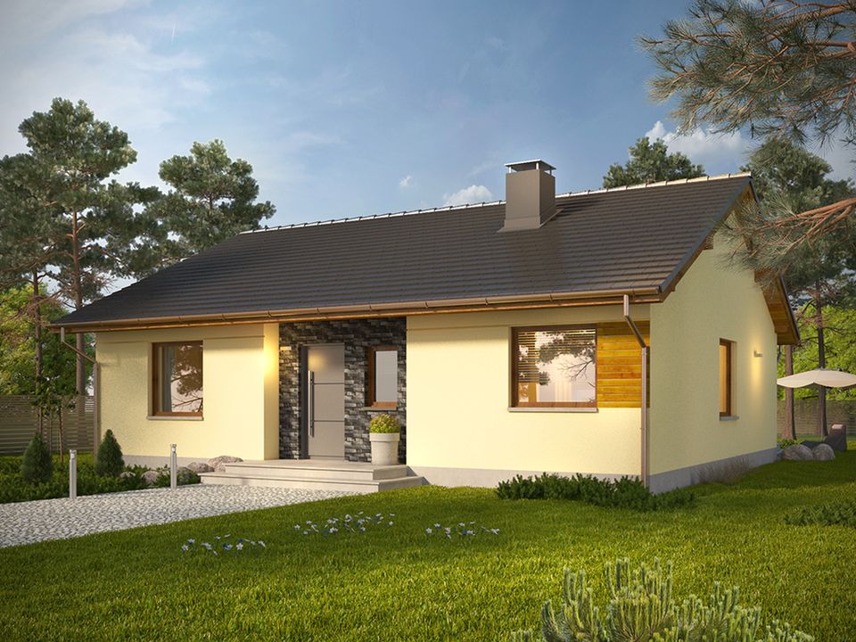 Graficzne opracowanie rzutów poglądowych widocznych na karcie projektu zostało wykonane przez Extradom.pl. Prezentowane przez Extradom.pl wizualizacje wykonane zostały przez autora projektu i należy poczytywać je jedynie za przykład i propozycję wykończenia, wizję architektoniczną autora projektu. Ostateczne wykończenie budynku może nastąpić na wiele sposobów. Szczegółowe rozwiązania zastosowane w oferowanej dokumentacji - w tym również ilość, lokalizacje i wygląd okien, drzwi, kominów - mogą w niewielkim stopniu różnić się od prezentowanej wizualizacji budynku.