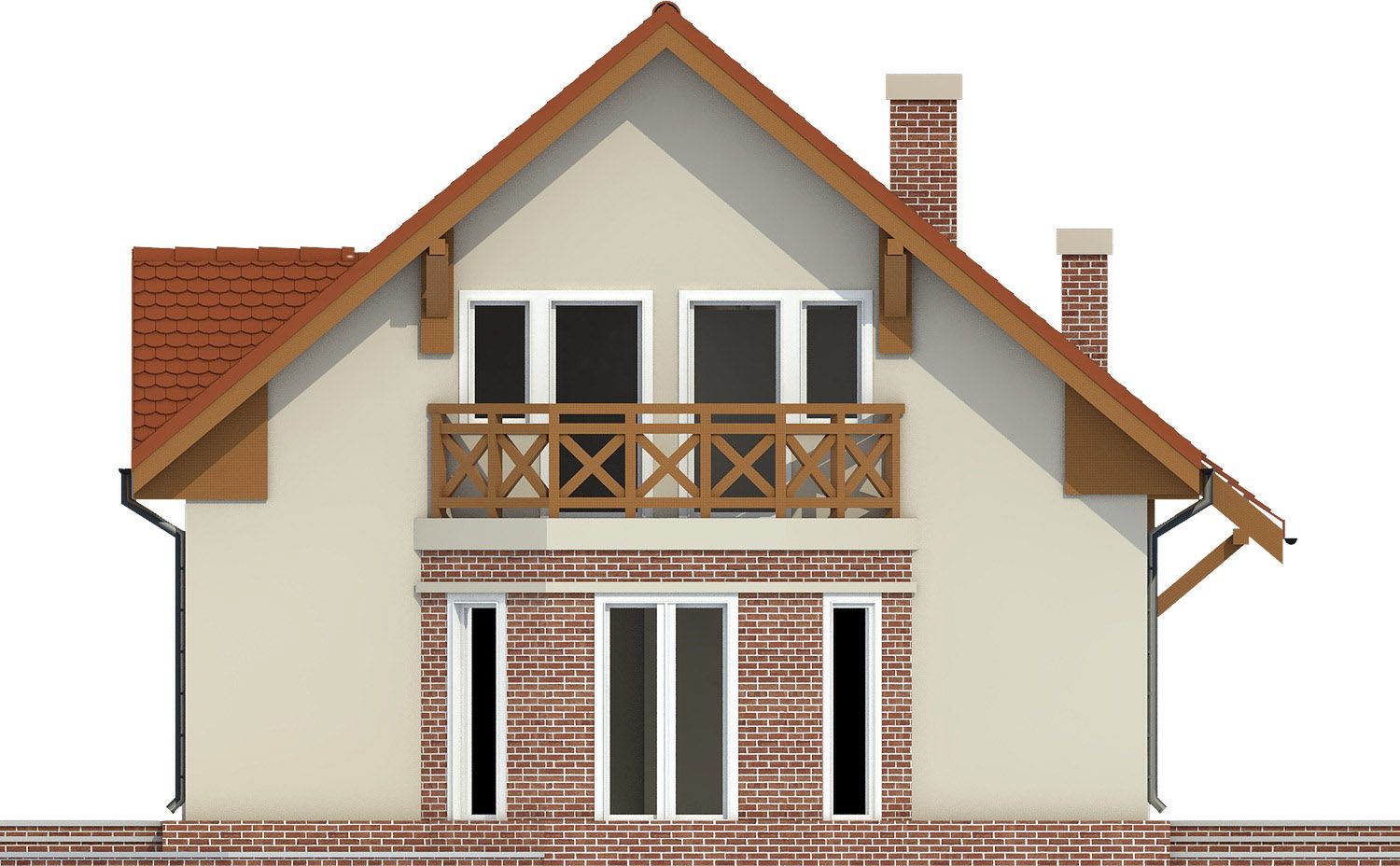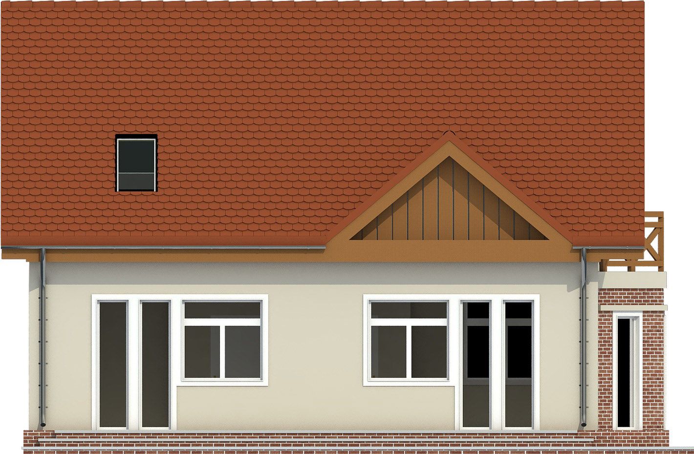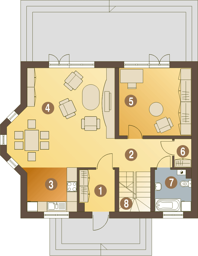 Graficzne opracowanie rzutów poglądowych widocznych na karcie projektu zostało wykonane przez Extradom.pl. Prezentowane przez Extradom.pl wizualizacje wykonane zostały przez autora projektu i należy poczytywać je jedynie za przykład i propozycję wykończenia, wizję architektoniczną autora projektu. Ostateczne wykończenie budynku może nastąpić na wiele sposobów. Szczegółowe rozwiązania zastosowane w oferowanej dokumentacji - w tym również ilość, lokalizacje i wygląd okien, drzwi, kominów - mogą w niewielkim stopniu różnić się od prezentowanej wizualizacji budynku.