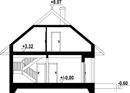 Wysokość ścianki kolankowej: 0.69 m. Strop: drewniany. Pokrycie dachu: dachówka ceramiczna. Ściany zewnętrzne: szkieletowe z tynkiem. Ściany wewnętrzne: szkieletowe drewniane. Typ ogrzewania: kocioł na paliwo stałe. Inne: okna połaciowe Fakro.