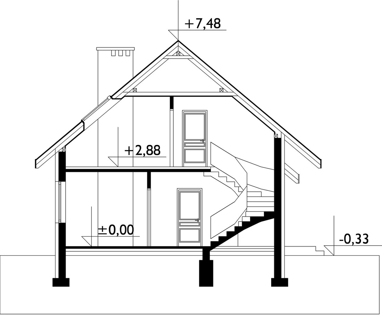 Wersja technologiczna: murowana - ceramika. Strop: żelbetowy monolityczny. Typ schodów: płytowe żelbetowe. Konstrukcja dachu: drewniana krokwiowo-jętkowa. Typ ogrzewania: Kocioł na gaz. Dostępna wersja z pompą ciepła: Tak. Ściany zewnętrzne: 25 cm ceramika. Ściany wewnętrzne: 25 cm ceramika. Ściany wewnętrzne działowe: 11 cm ceramika.
