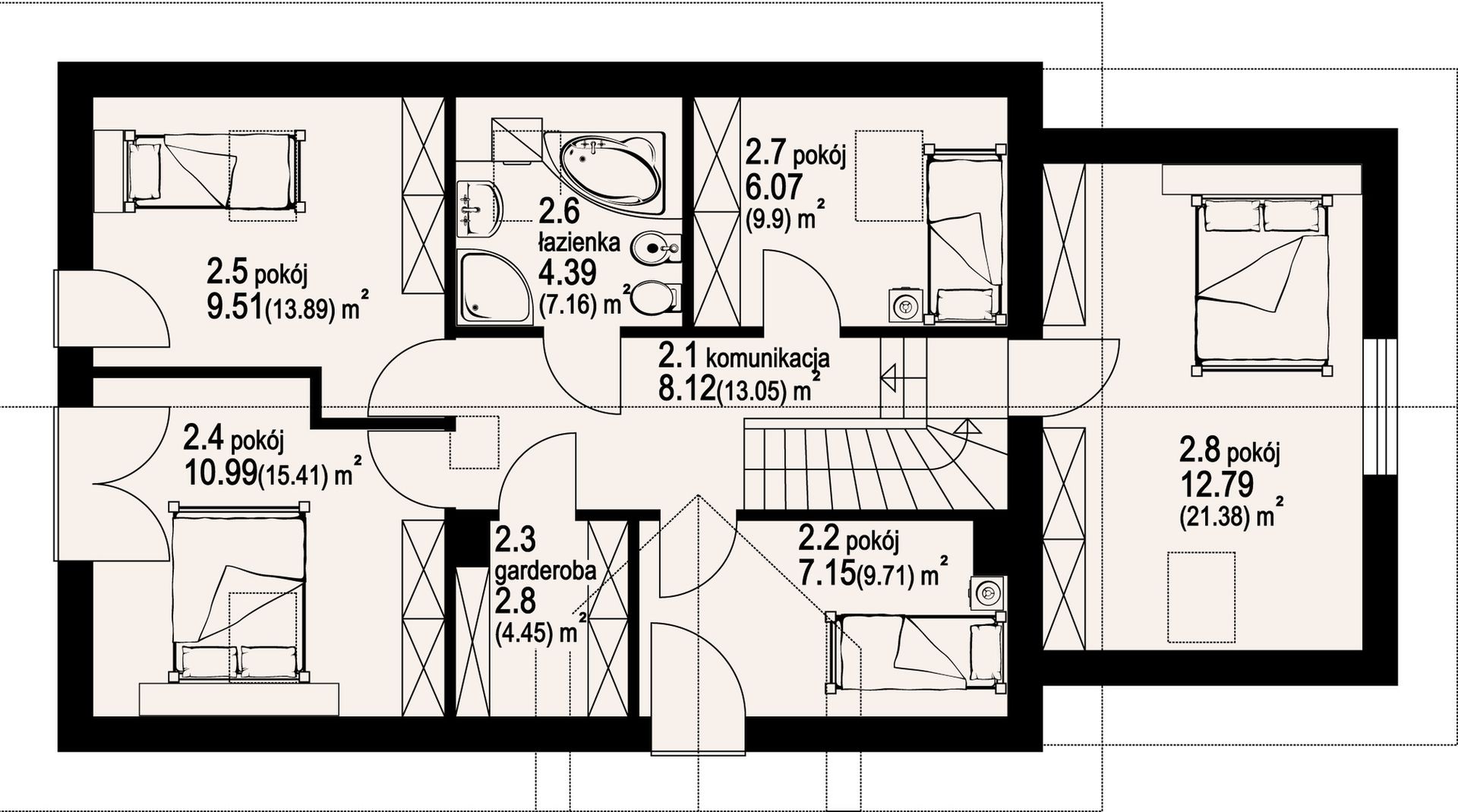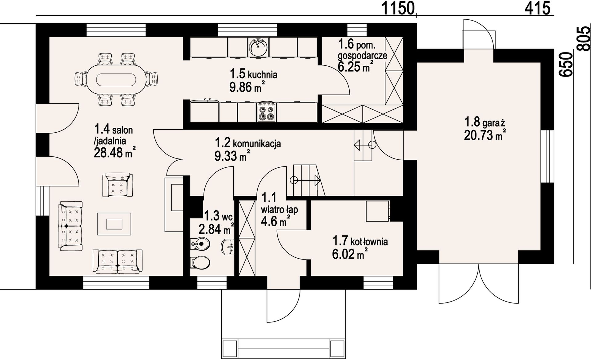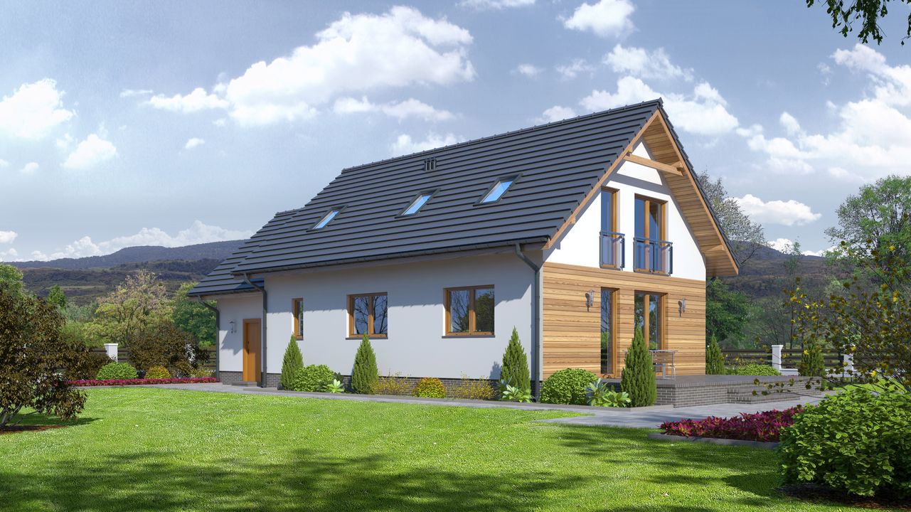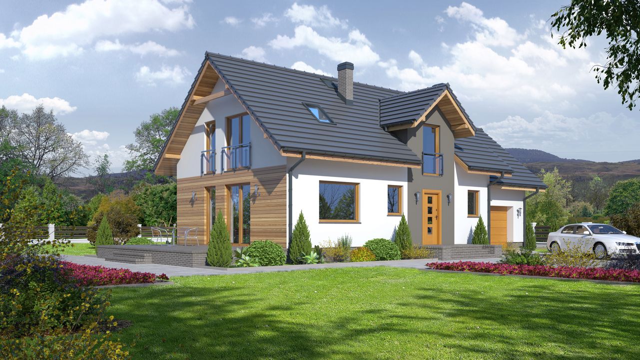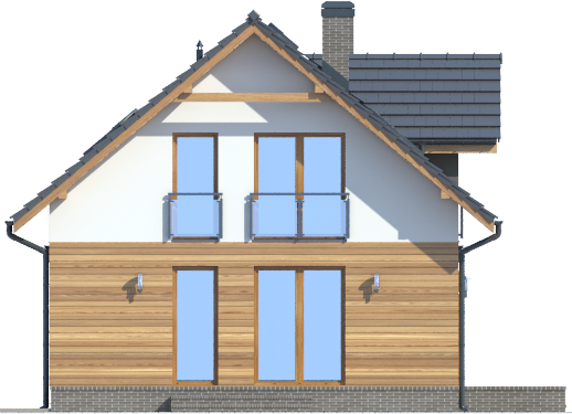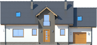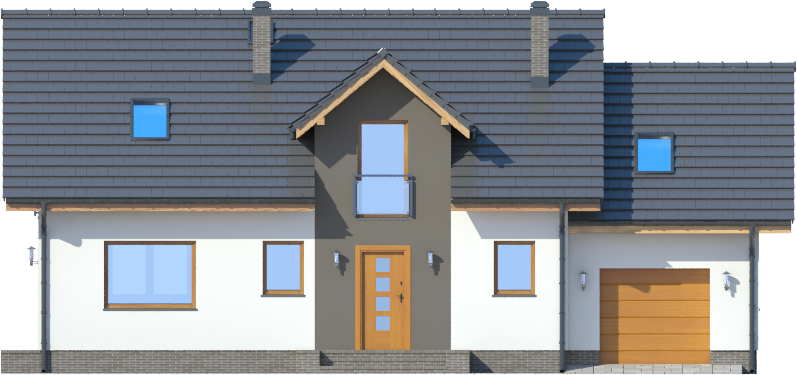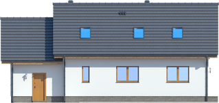 Graficzne opracowanie rzutów poglądowych widocznych na karcie projektu zostało wykonane przez Extradom.pl. Prezentowane przez Extradom.pl wizualizacje wykonane zostały przez autora projektu i należy poczytywać je jedynie za przykład i propozycję wykończenia, wizję architektoniczną autora projektu. Ostateczne wykończenie budynku może nastąpić na wiele sposobów. Szczegółowe rozwiązania zastosowane w oferowanej dokumentacji - w tym również ilość, lokalizacje i wygląd okien, drzwi, kominów - mogą w niewielkim stopniu różnić się od prezentowanej wizualizacji budynku.