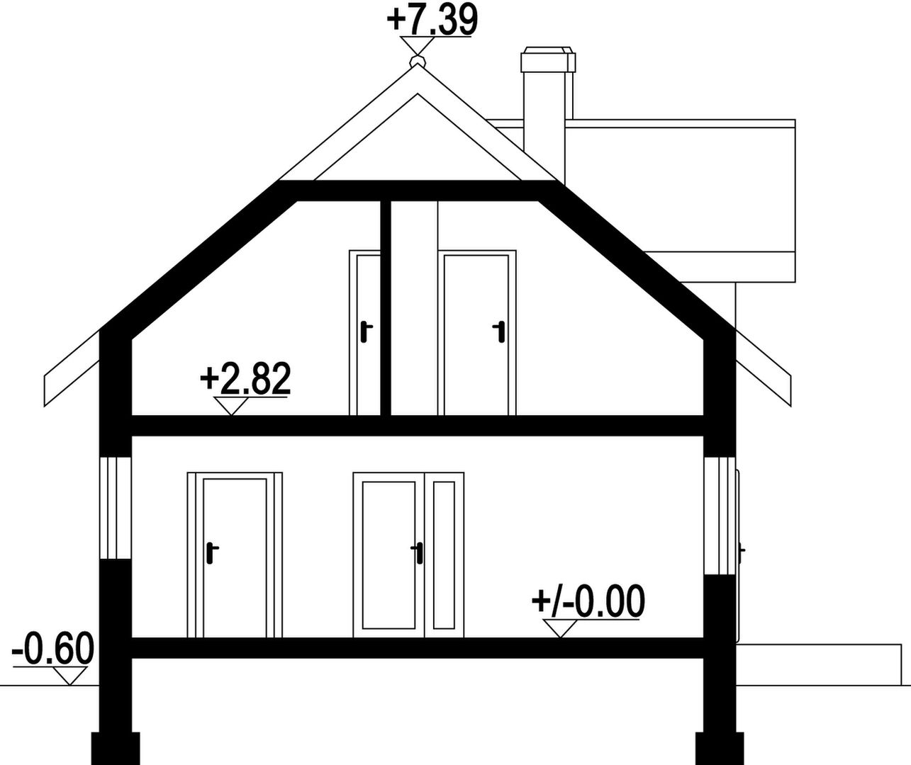 Wysokość ścianki kolankowej: 0.99 m. Strop: płyta żelbetowa. Pokrycie dachu: dachówka ceramiczna. Ściany zewnętrzne: pustaki ceramiczne + styropian. Ściany wewnętrzne: pustaki ceramiczne. Typ ogrzewania: kocioł gazowy lub kocioł na paliwo stałe. Inne: okna połaciowe Fakro.