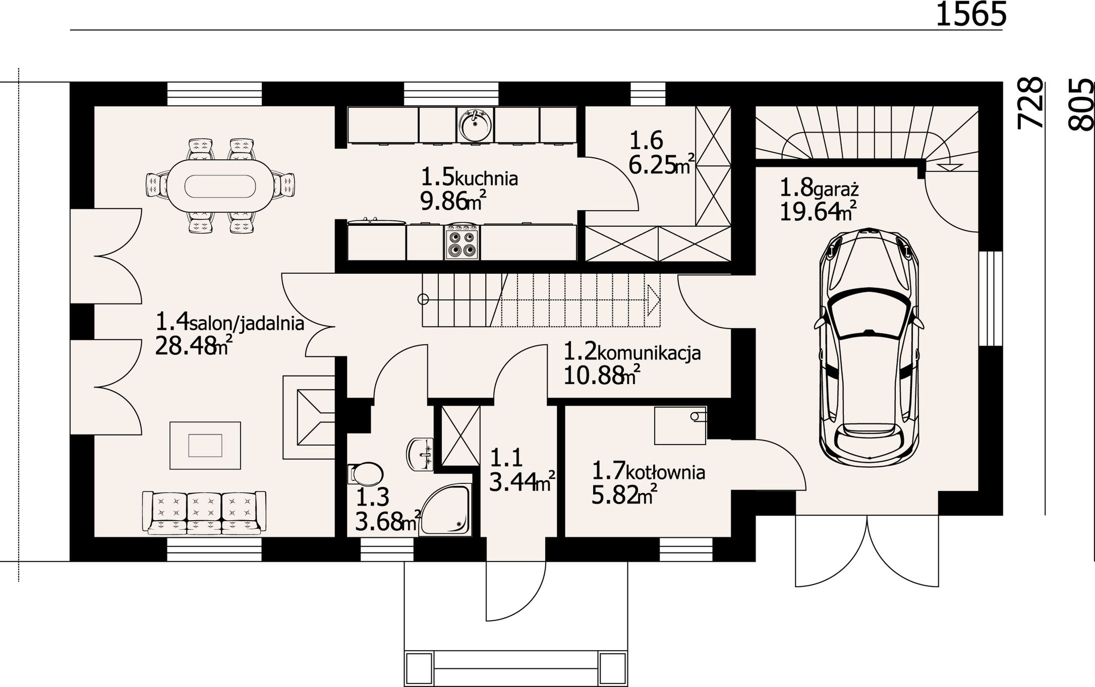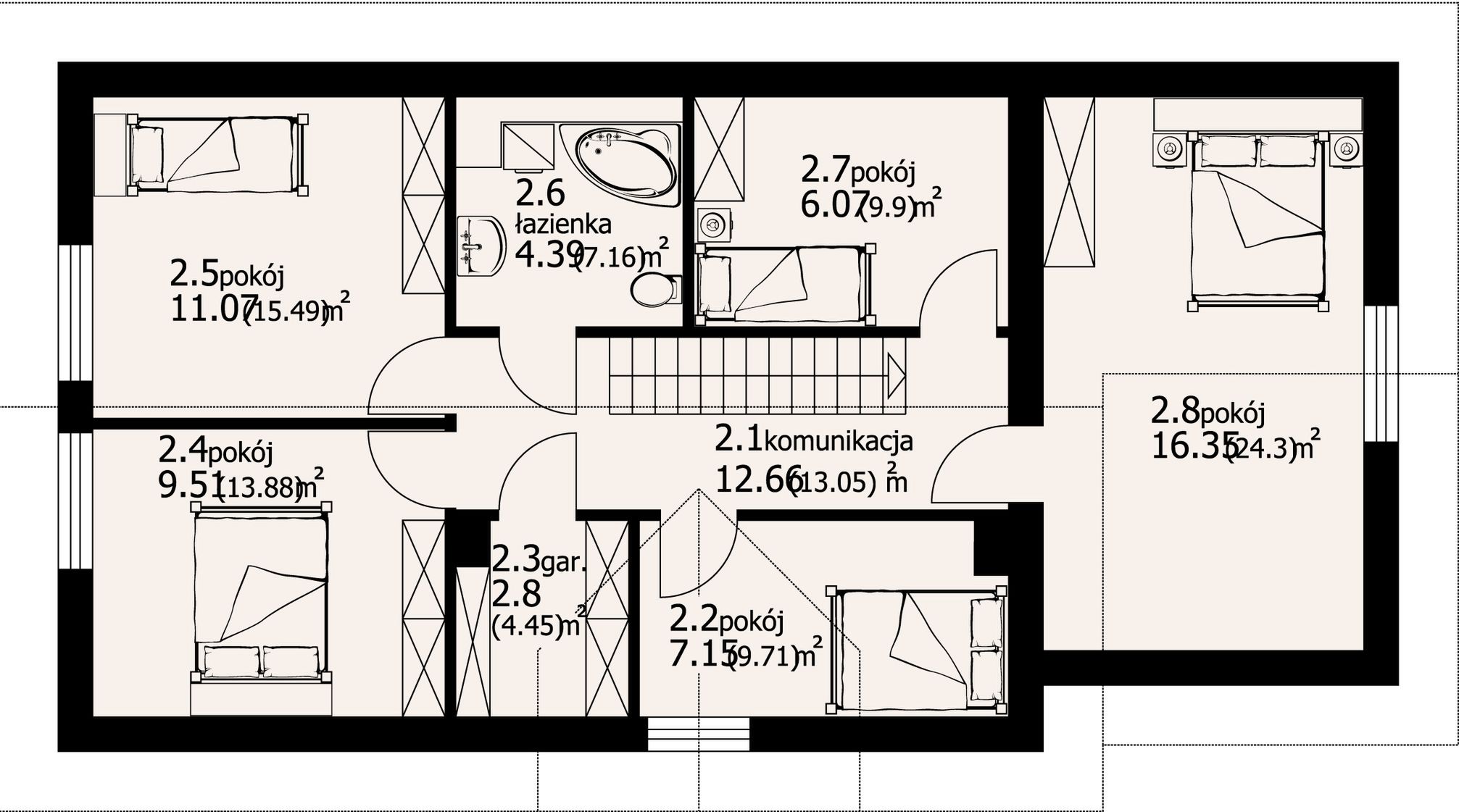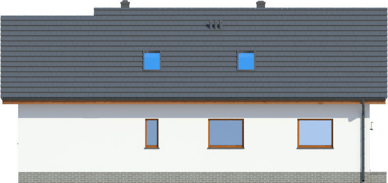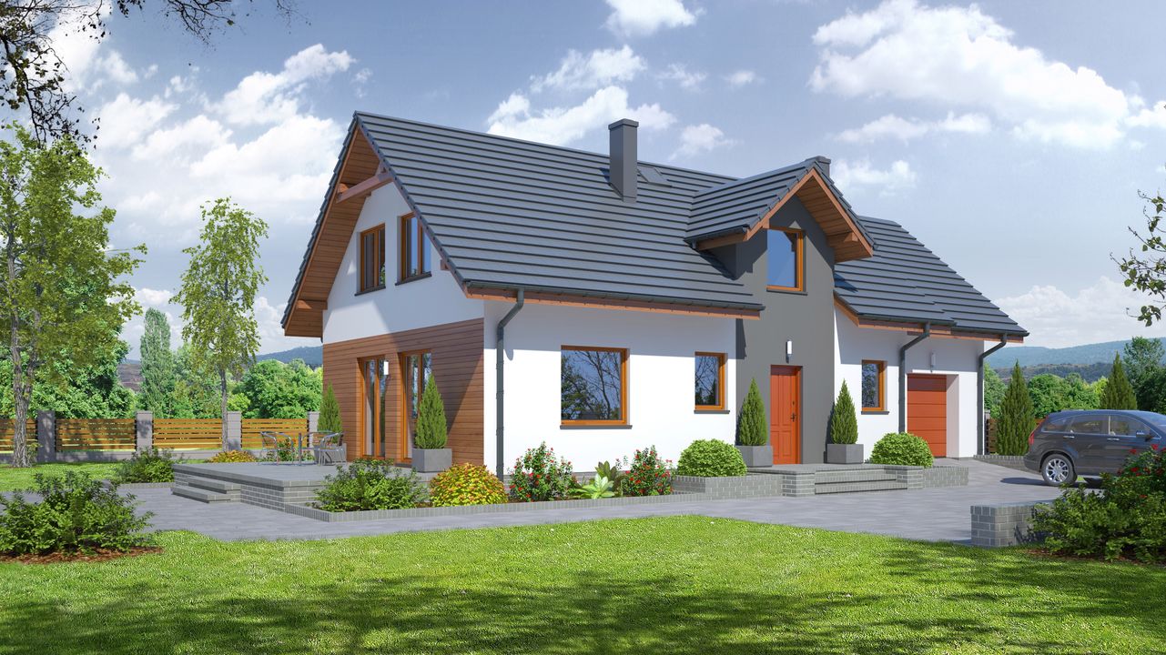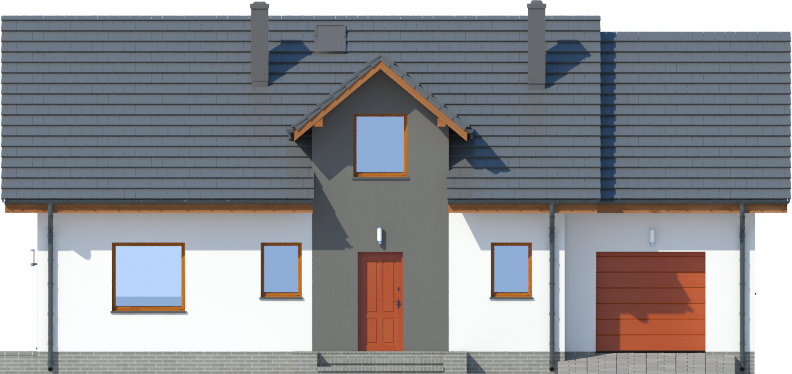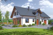 Graficzne opracowanie rzutów poglądowych widocznych na karcie projektu zostało wykonane przez Extradom.pl. Prezentowane przez Extradom.pl wizualizacje wykonane zostały przez autora projektu i należy poczytywać je jedynie za przykład i propozycję wykończenia, wizję architektoniczną autora projektu. Ostateczne wykończenie budynku może nastąpić na wiele sposobów. Szczegółowe rozwiązania zastosowane w oferowanej dokumentacji - w tym również ilość, lokalizacje i wygląd okien, drzwi, kominów - mogą w niewielkim stopniu różnić się od prezentowanej wizualizacji budynku.