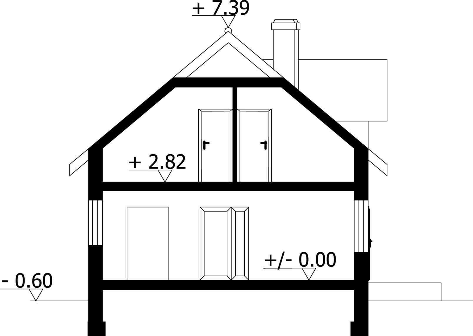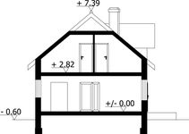 Wysokość ścianki kolankowej: 0.99 m. Strop: płyta żelbetowa. Pokrycie dachu: dachówka ceramiczna. Ściany zewnętrzne: pustaki ceramiczne + styropian. Ściany wewnętrzne: pustaki ceramiczne. Typ ogrzewania: kocioł gazowy lub kocioł na paliwo stałe. Inne: okna połaciowe Fakro.