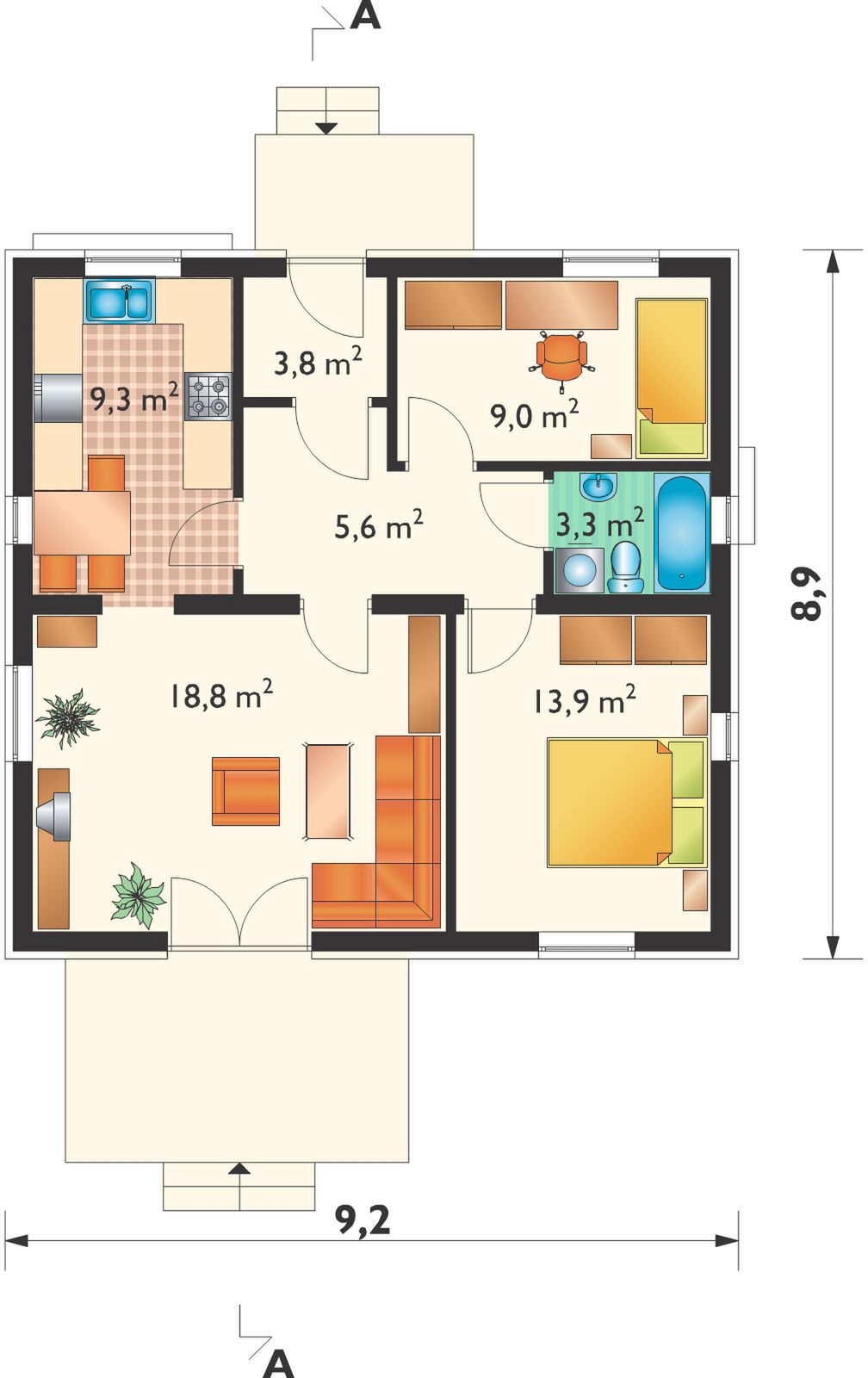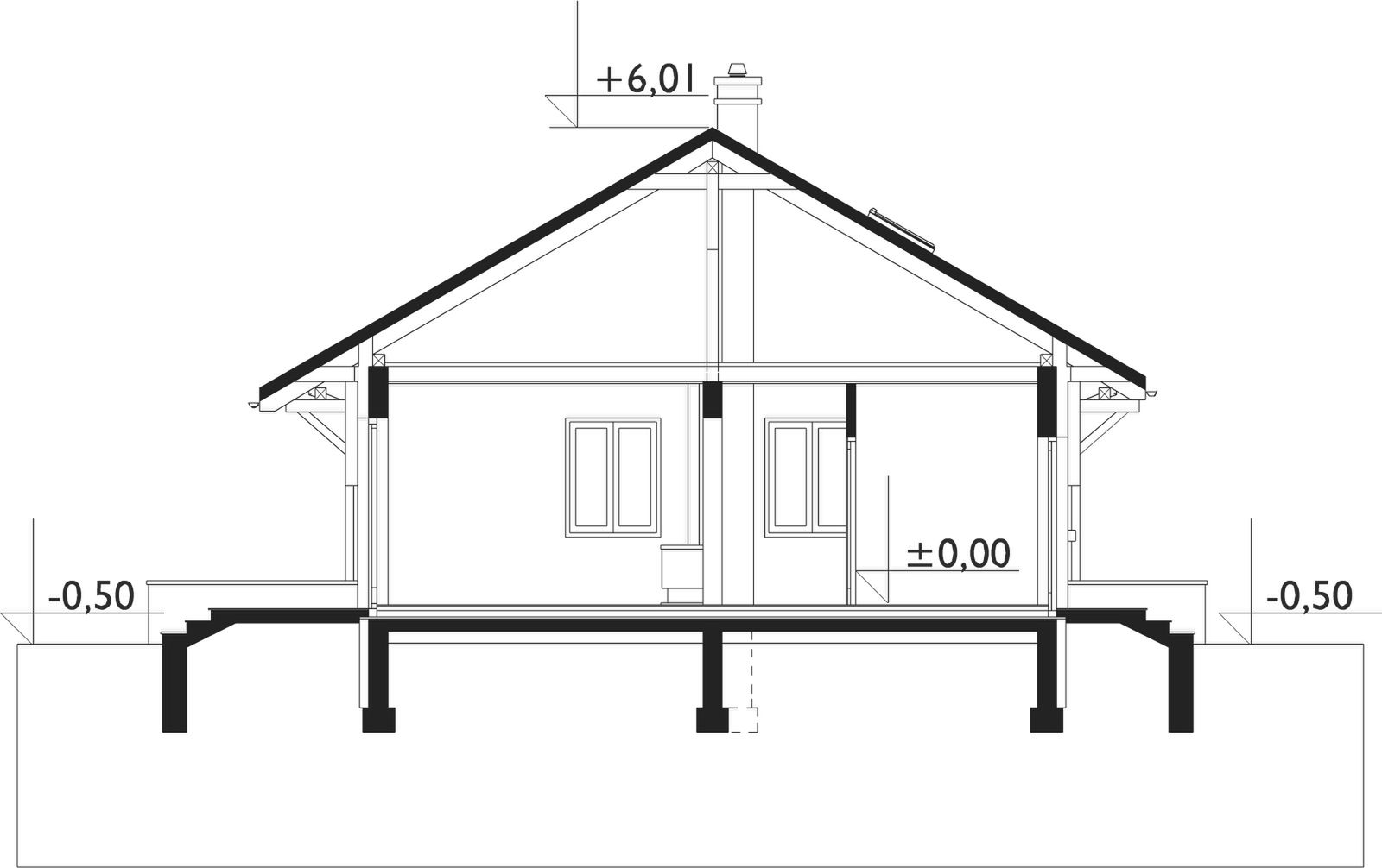 Wersja technologiczna: murowana - beton komórkowy. Strop: drewniany belkowy. Typ schodów: brak. Konstrukcja dachu: drewniana krokwiowa. Typ ogrzewania: Kocioł na gaz. Dostępna wersja z pompą ciepła: Tak. Ściany zewnętrzne: 24 cm beton komórkowy. Ściany wewnętrzne: 24 cm beton komórkowy. Ściany wewnętrzne działowe: 12 cm beton komórkowy.