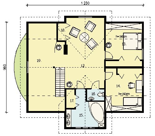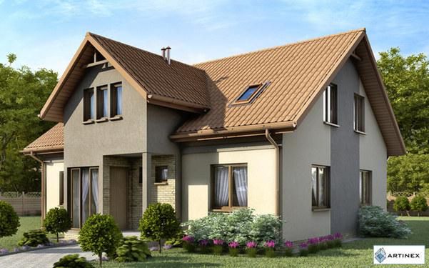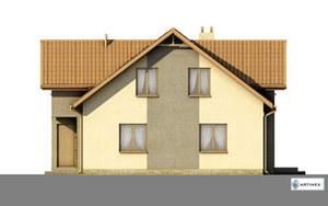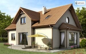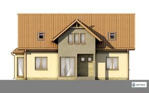 Graficzne opracowanie rzutów poglądowych widocznych na karcie projektu zostało wykonane przez Extradom.pl. Prezentowane przez Extradom.pl wizualizacje wykonane zostały przez autora projektu i należy poczytywać je jedynie za przykład i propozycję wykończenia, wizję architektoniczną autora projektu. Ostateczne wykończenie budynku może nastąpić na wiele sposobów. Szczegółowe rozwiązania zastosowane w oferowanej dokumentacji - w tym również ilość, lokalizacje i wygląd okien, drzwi, kominów - mogą w niewielkim stopniu różnić się od prezentowanej wizualizacji budynku.