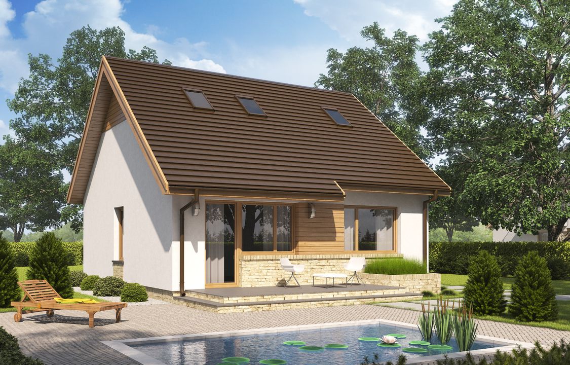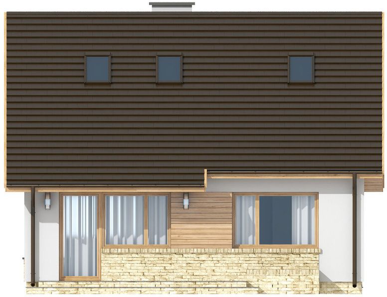 Graficzne opracowanie rzutów poglądowych widocznych na karcie projektu zostało wykonane przez Extradom.pl. Prezentowane przez Extradom.pl wizualizacje wykonane zostały przez autora projektu i należy poczytywać je jedynie za przykład i propozycję wykończenia, wizję architektoniczną autora projektu. Ostateczne wykończenie budynku może nastąpić na wiele sposobów. Szczegółowe rozwiązania zastosowane w oferowanej dokumentacji - w tym również ilość, lokalizacje i wygląd okien, drzwi, kominów - mogą w niewielkim stopniu różnić się od prezentowanej wizualizacji budynku.