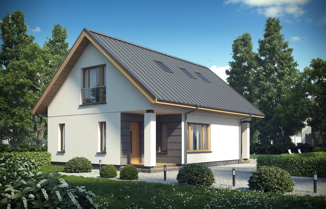 Graficzne opracowanie rzutów poglądowych widocznych na karcie projektu zostało wykonane przez Extradom.pl. Prezentowane przez Extradom.pl wizualizacje wykonane zostały przez autora projektu i należy poczytywać je jedynie za przykład i propozycję wykończenia, wizję architektoniczną autora projektu. Ostateczne wykończenie budynku może nastąpić na wiele sposobów. Szczegółowe rozwiązania zastosowane w oferowanej dokumentacji - w tym również ilość, lokalizacje i wygląd okien, drzwi, kominów - mogą w niewielkim stopniu różnić się od prezentowanej wizualizacji budynku.
