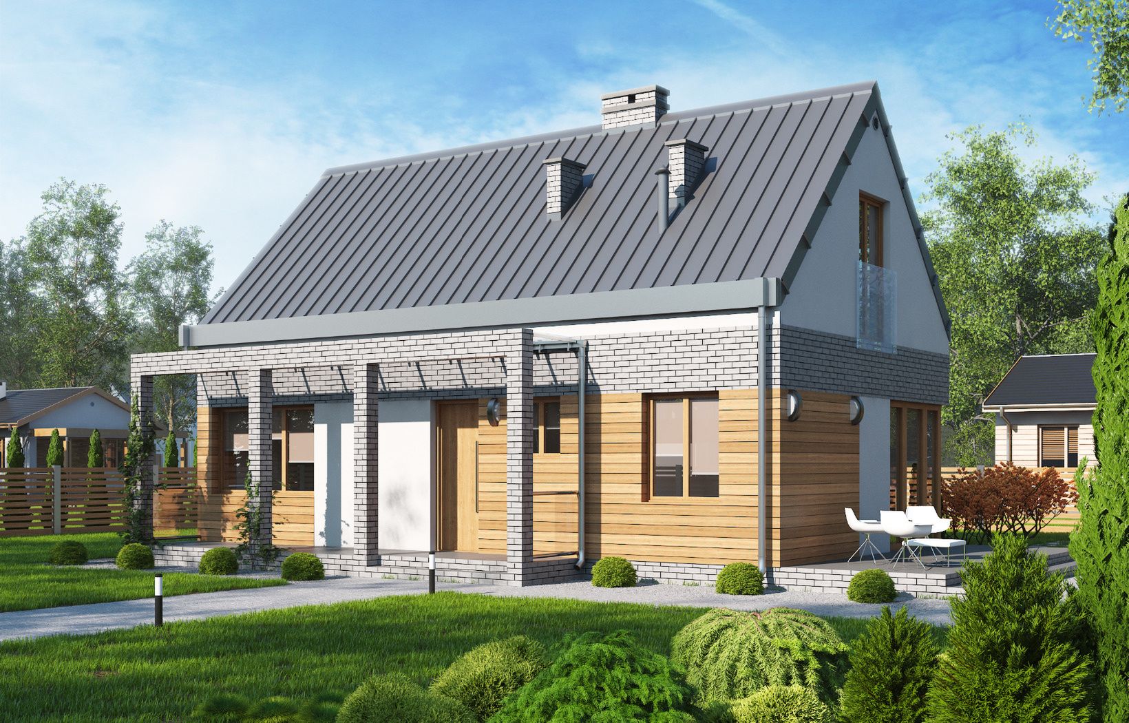 Graficzne opracowanie rzutów poglądowych widocznych na karcie projektu zostało wykonane przez Extradom.pl. Prezentowane przez Extradom.pl wizualizacje wykonane zostały przez autora projektu i należy poczytywać je jedynie za przykład i propozycję wykończenia, wizję architektoniczną autora projektu. Ostateczne wykończenie budynku może nastąpić na wiele sposobów. Szczegółowe rozwiązania zastosowane w oferowanej dokumentacji - w tym również ilość, lokalizacje i wygląd okien, drzwi, kominów - mogą w niewielkim stopniu różnić się od prezentowanej wizualizacji budynku.