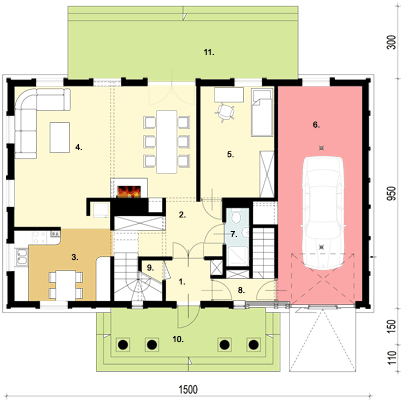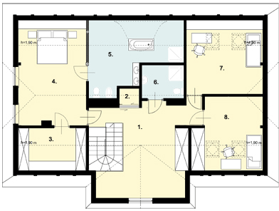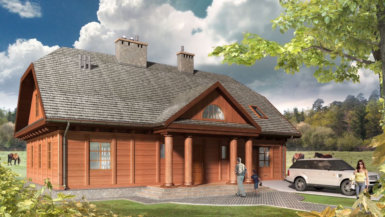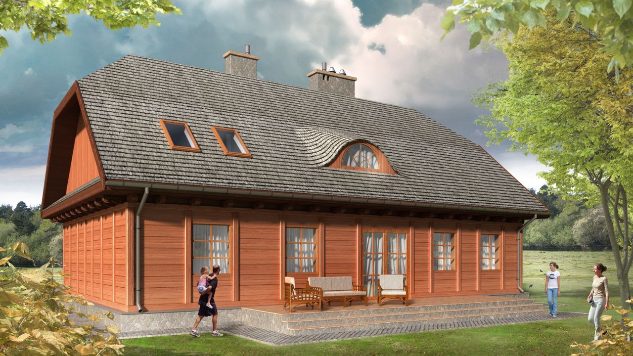 Graficzne opracowanie rzutów poglądowych widocznych na karcie projektu zostało wykonane przez Extradom.pl. Prezentowane przez Extradom.pl wizualizacje wykonane zostały przez autora projektu i należy poczytywać je jedynie za przykład i propozycję wykończenia, wizję architektoniczną autora projektu. Ostateczne wykończenie budynku może nastąpić na wiele sposobów. Szczegółowe rozwiązania zastosowane w oferowanej dokumentacji - w tym również ilość, lokalizacje i wygląd okien, drzwi, kominów - mogą w niewielkim stopniu różnić się od prezentowanej wizualizacji budynku.