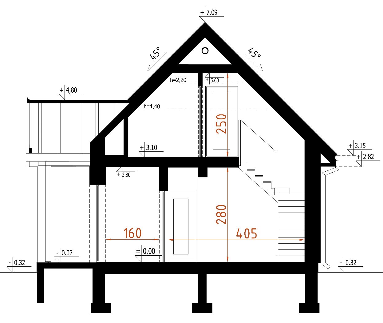 Ściany zewnętrzne: murowane, dwuwarstwowe,pustak gazobetonowy 24 cm + styropian 20cm. Strop: płyta żelbetowa. Konstrukcja dachu: krokwie. Pokrycie dachu: blachodachówka. Elewacja: tynk cienkowarstwowy, na fragmentach ścian deski i płytki klinkieroweogrzewanie gazowe.