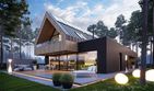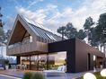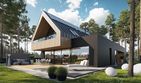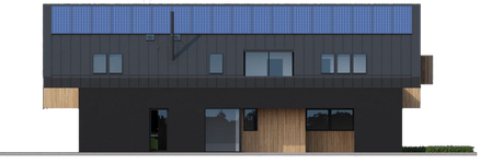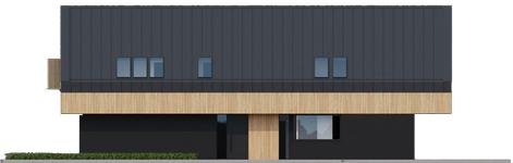 Fundamenty: płyta fundamentowa. Ściany zewnętrzne: murowane, dwuwarstwowe, beton komórkowy 24 cm, ocieplenie styropian lub wełna mineralna 25 cm. Ściany wewnętrzne: nośne i działowe murowane, beton komórkowy 24 cm i 12 cm. Strop i stropodach nad garażem: strop żelbetowy lub gęstożebrowy Teriva - zgodnie z PT, stropodach pełny, ocieplenie wełna mineralna lub styropian 20 cm. Dach: konstrukcja drewniana, ocieplenie wełna mineralna 30 cm, krycie dachu: blacha na rąbek stojący. Inne: schody wewnętrzne drewniane. Ogrzewanie: pompa ciepła typu powietrze/woda lub solanka/woda, rozprowadzenie ciepła - ogrzewanie podłogowe. Wentylacja: wentylacja mechaniczna nawiewno-wywiewna z odzyskiem ciepła. Dodatkowo: panele fotowoltaiczne, stacja uzdatniania wody, gniazdo instalacji elektrycznej do ładowania auta. Elewacje: tynk cienkowarstwowy mineralny w kolorze grafitowym wg palety kolorów wybranego producenta, okładzina drewniana wg technologii montażu i barwienia drewna wybranego producenta; rekomendowany kolor okładziny drewnianej: teak lub modrzew syberyjski, ułożenie desek pionowe, blacha tytanowo-cynkowa w kolorze antracytowym. Stolarka: aluminiowa np. firmy Reynaers, drzwi podnoszono-przesuwne typu HS oraz fasada aluminiowo-szklana, drzwi wejściowe i brama garażowa kolorystycznie dopasowane do systemu okiennego. Okna połaciowe: firmy Velux - rozwiązania technologiczne, świetliki tunelowe dopasowane do systemu pokrycia dachowego. Otoczenie: płyty tarasowe i kostka betonowa, system tarasowy - deska kompozytowa lub drewno naturalne w kolorze współgrającym z elewacją.