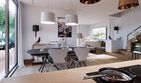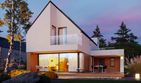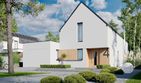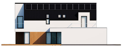 Fundamenty: płyta fundamentowa. Ściany zewnętrzne: murowane, dwuwarstwowe, beton komórkowy 24 cm, ocieplenie styropian 20 cm. Ściany wewnętrzne: murowane, beton komórkowy 12 cm. Strop i stropodach nad garażem: międzypiętrowy gęstożebrowy Teriva, stropodach pełny, ocieplenie wełna mineralna 30 cm. Dach: konstrukcja drewniana, ocieplenie wełna mineralna 30 cm, krycie dachu: blacha na rąbek stojący w kolorze grafitowym. Inne: schody wewnętrzne drewniane. Ogrzewanie: powietrzna pompa ciepła, rozprowadzenie ciepła: parter - płyta grzejna jako system ogrzewania podłogowego, poddasze - ogrzewanie podłogowe. Wentylacja: wentylacja mechaniczna nawiewno-wywiewna z odzyskiem ciepła. Dodatkowo: panele fotowoltaiczne, stacja uzdatniania wody, gniazdo instalacji elektrycznej do ładowania auta. Elewacje: tynk cienkowarstwowy mineralny w kolorze białym wg palety kolorów wybranego producenta, okładzina drewniana wg technologii montażu i barwienia drewna wybranego producenta; rekomendowany kolor okładziny drewnianej: modrzew syberyjski, ułożenie desek pionowe. Stolarka: drewniana, PVC lub aluminiowa, drzwi podnoszono-przesuwne typu HS oraz fasada aluminiowo-szklana, drzwi wejściowe i brama garażowa kolorystycznie dopasowane do systemu okiennego. Okna połaciowe: rozwiązania technologiczne i wyłaz dachowy dopasowane do systemu pokrycia dachowego. Otoczenie: płyty tarasowe i kostka betonowa, system tarasowy - deska kompozytowa lub drewno naturalne w kolorze współgrającym z elewacją.