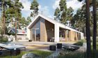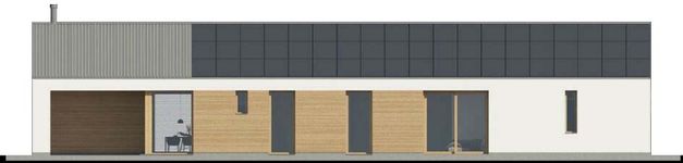 Fundamenty: płyta fundamentowa. Ściany zewnętrzne: murowane, dwuwarstwowe, beton komórkowy 24 cm, ocieplenie styropian 24 cm. Ściany wewnętrzne: nośne i działowe murowane, beton komórkowy 24 cm i 12 cm. Strop: strop gęstożebrowy Teriva, ocieplenie wełna mineralna 30 cm. Dach: konstrukcja drewniana, ocieplenie wełna mineralna 32 cm, krycie dachu: blacha trapezowa w kolorze szarym, więźba dachowa dostępna również w systemie prefabrykacji drewnianej. Ogrzewanie: pompa ciepła typu powietrze / woda, rozprowadzenie ciepła - ogrzewanie podłogowe. Wentylacja: wentylacja mechaniczna nawiewno-wywiewna z odzyskiem ciepła. Dodatkowo: panele fotowoltaiczne, stacja uzdatniania wody, gniazdo instalacji elektrycznej do ładowania auta. Elewacje: tynk cienkowarstwowy mineralny w kolorze białym wg palety kolorów wybranego producenta, okładzina drewniana wg technologii montażu i barwienia drewna wybranego producenta; rekomendowany kolor okładziny drewnianej: modrzew syberyjski lub cedr kanadyjski, ułożenie desek poziome. Stolarka: drewniana, PVC lub aluminiowa, drzwi podnoszono-przesuwne typu HS oraz fasada aluminiowo-szklana, drzwi wejściowe i brama garażowa kolorystycznie dopasowane do systemu okiennego, żaluzje przeciwsłoneczne w systemie współgrającym z systemem okien. Okna połaciowe: rozwiązania technologiczne, świetliki tunelowe dopasowane do systemu pokrycia dachowego. Otoczenie: płyty tarasowe i kostka betonowa, system tarasowy - deska kompozytowa lub drewno naturalne w kolorze współgrającym z elewacją.